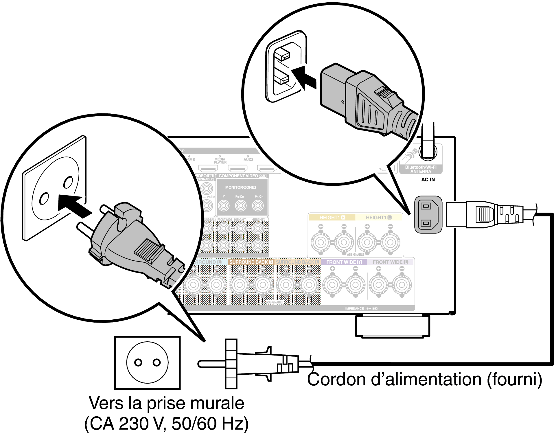 Une fois toutes les connexions effectuées, insérez la fiche d’alimentation dans la prise murale.