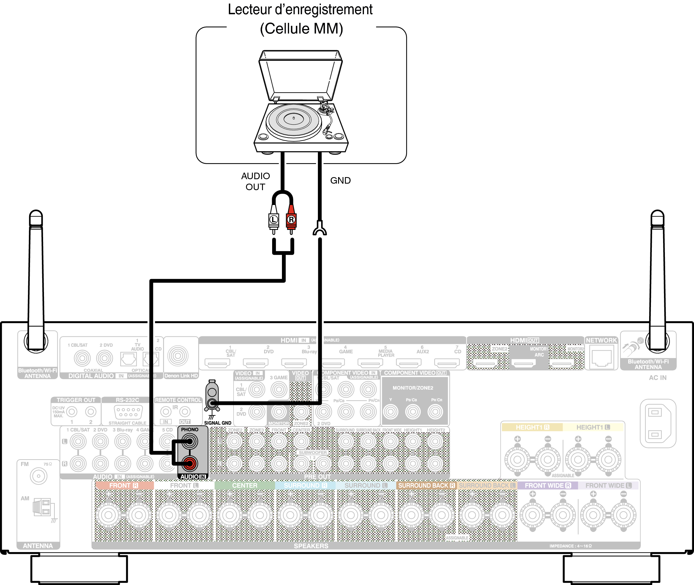 Cet appareil est compatible avec les platines équipées d’une cellule phono avec aimant tournant. Si vous le connectez à une platine dotée d’une cellule MC à faible sortie, utilisez un amplificateur de tête MC ou un transformateur survolteur du commerce.