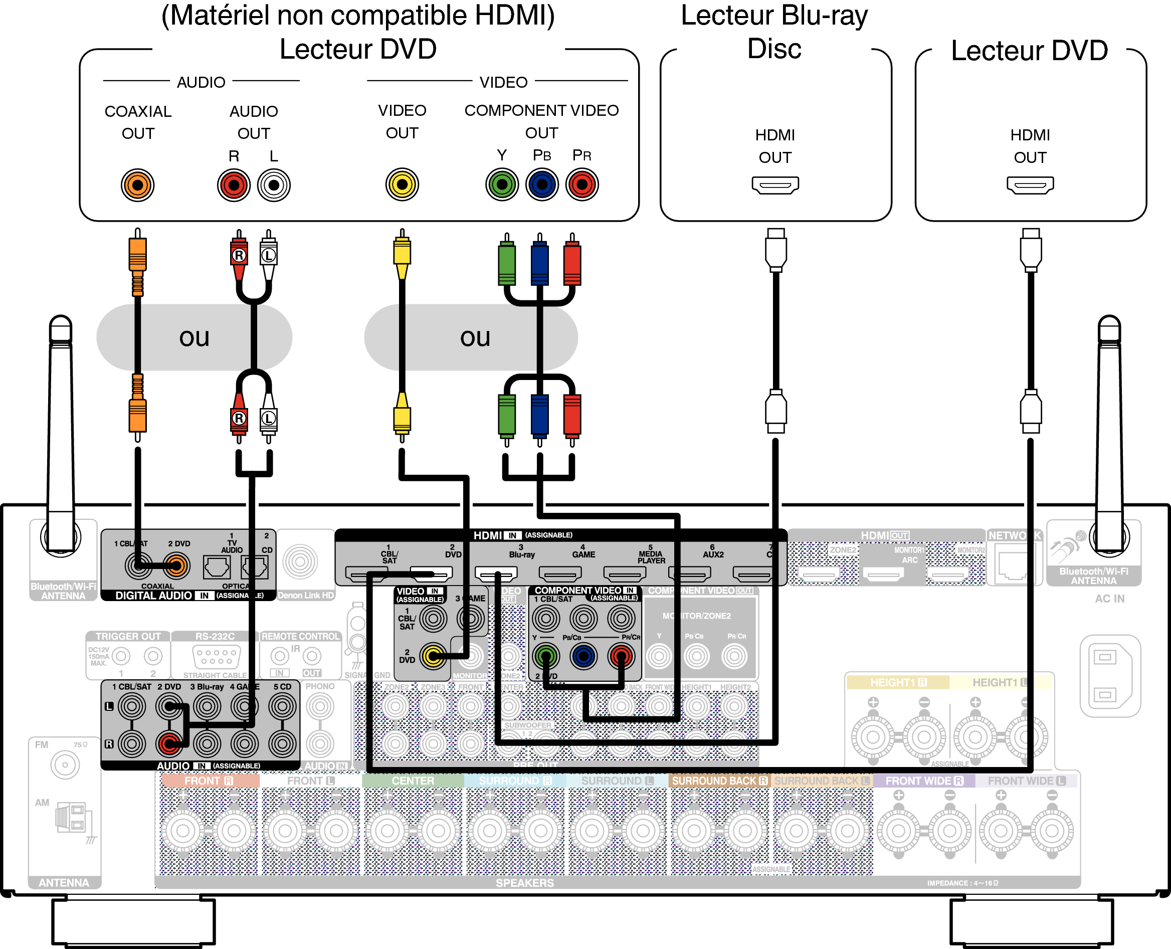 Lors de la connexion d’un lecteur de disques Blu-ray compatible avec Denon Link HD, voir “Connexion d’un lecteur Blu-ray Disc compatible avec la fonction Denon Link HD ”lien.