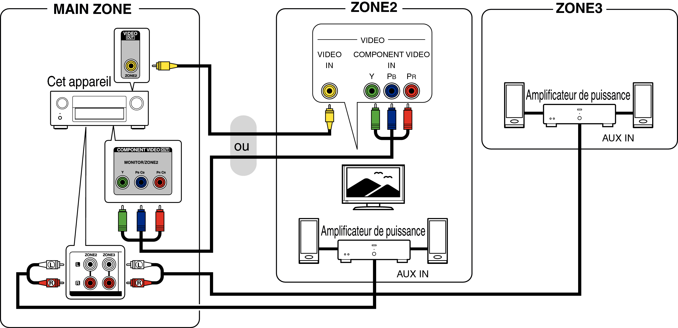 Lorsque “Sortie vid.composantes” dans le menu est défini sur “ZONE2”, la borne de sortie vidéo composante transmet la vidéo de la ZONE2. lien
