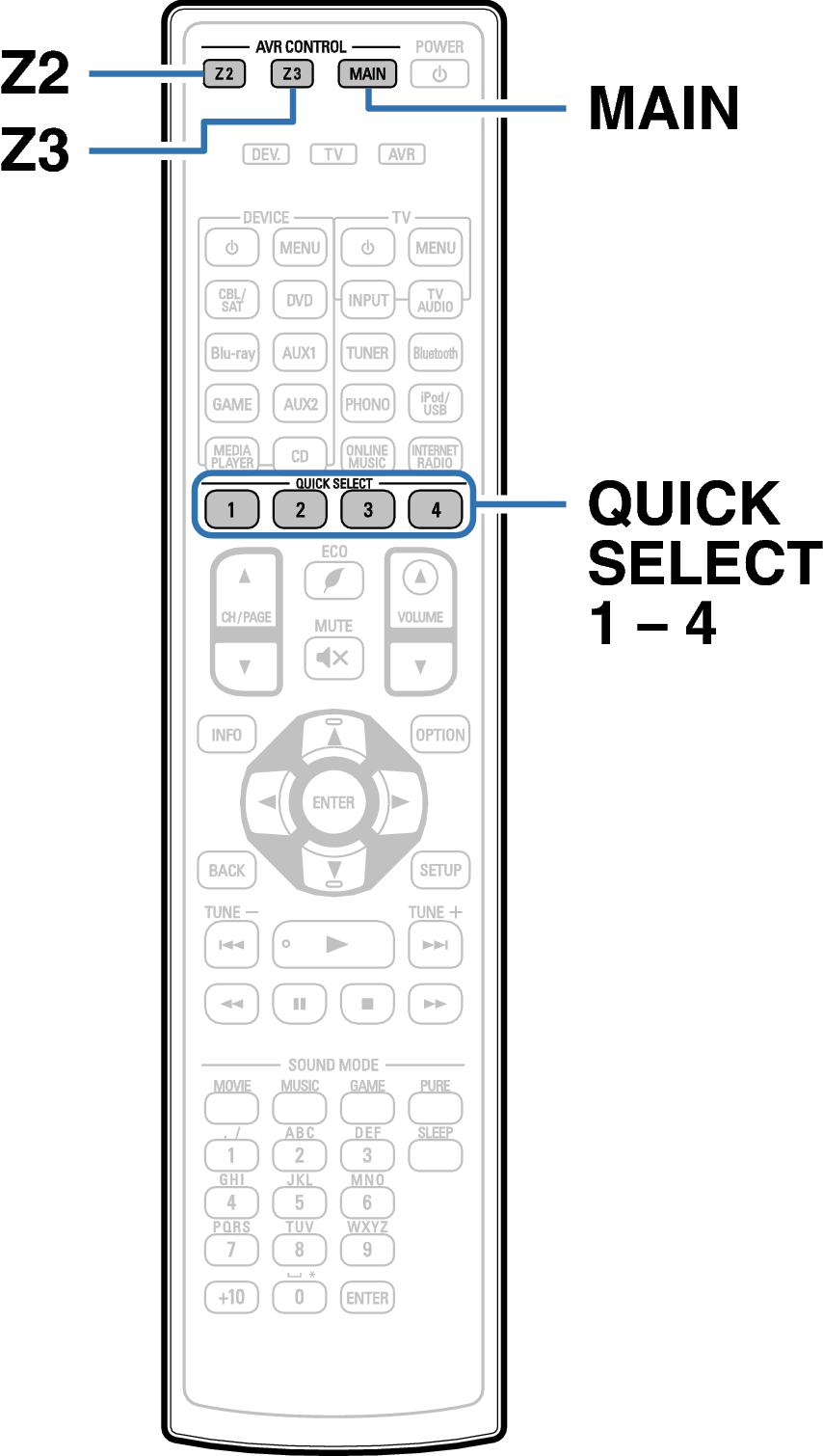 De QUICK SELECT-toets op dit toestel kan alleen worden gebruikt voor het bedienen van de MAIN ZONE.