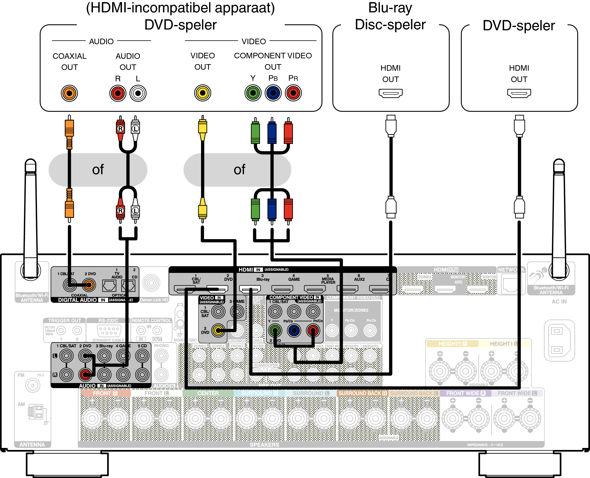 Wanneer u een Blu-ray-disc-speler aansluit die compatibel is met Denon Link HD, zie “Een Blu-ray-Discspeler aansluiten die compatibel is met de Denon Link HD-functie”koppeling.