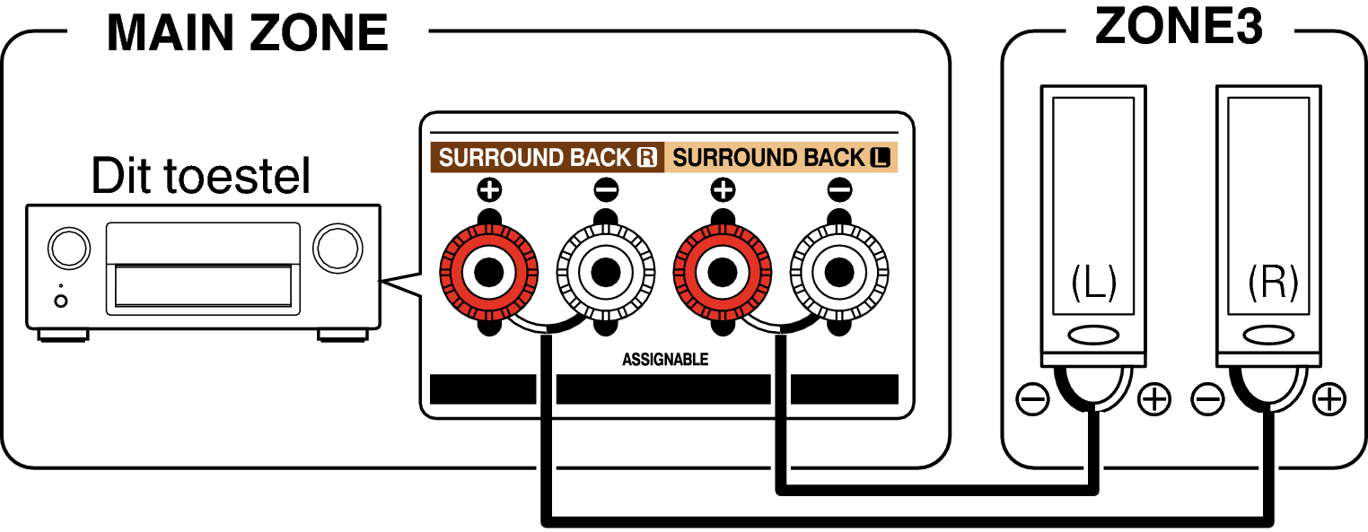 De audiosignalen van de ZONE2- en ZONE3-audio-uitgangen van dit toestel worden uitgevoerd naar de ZONE2- en ZONE3-versterkers en afgespeeld via deze versterkers.