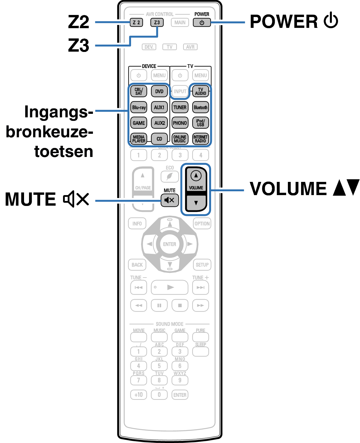 Voor het uitvoeren van een bediening met het hoofdtoestel, moet u herhaaldelijk op ZONE2 SOURCE of ZONE3 SOURCE drukken. Telkens wanneer u op ZONE2 SOURCE of ZONE3 SOURCE drukt, verandert de ingangsbron.