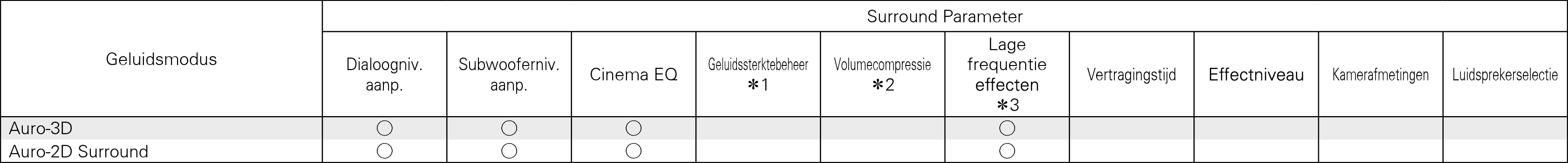 Dit kan worden ingesteld als het ingangssignaal geen Auro-3D-signaal bevat of als het ingevoerd Auro-3D-signaal geen kanalen voor hoog bevat.