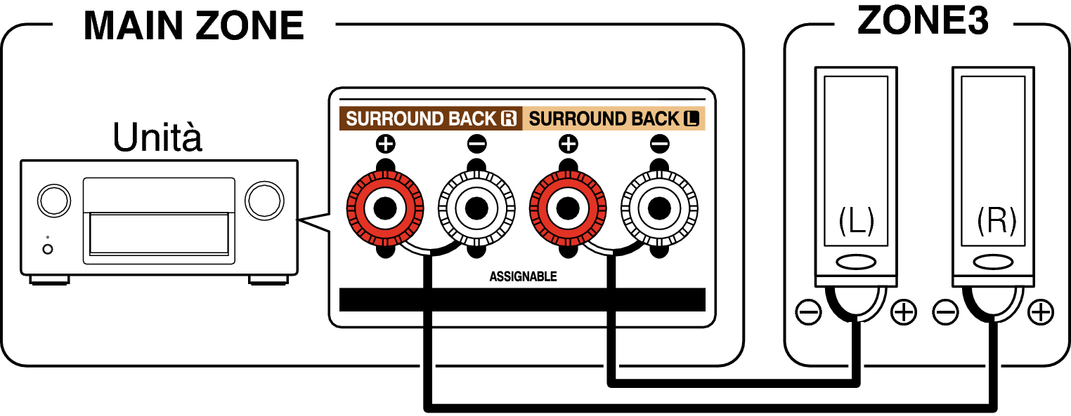 I segnali audio dei connettori di uscita audio della ZONE2 e ZONE3 dell’unità sono trasmessi agli amplificatori della ZONE2 e ZONE3 e riprodotti su questi amplificatori.