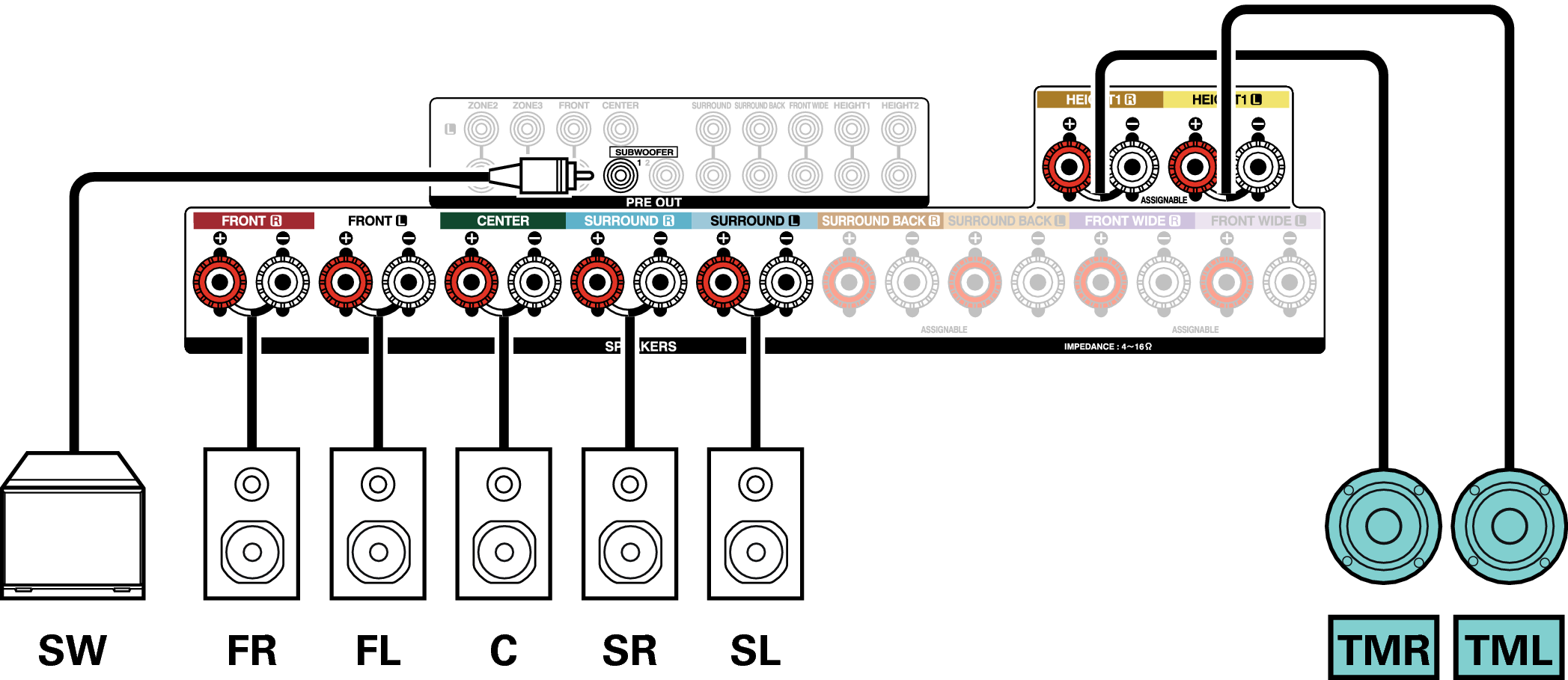 È possibile collegare i diffusori di altezza posteriori al posto dei diffusori di altezza anteriori. In questo caso, impostare i diffusori di altezza da collegare in “Superiore” - “Disposizione” nel menu. link
