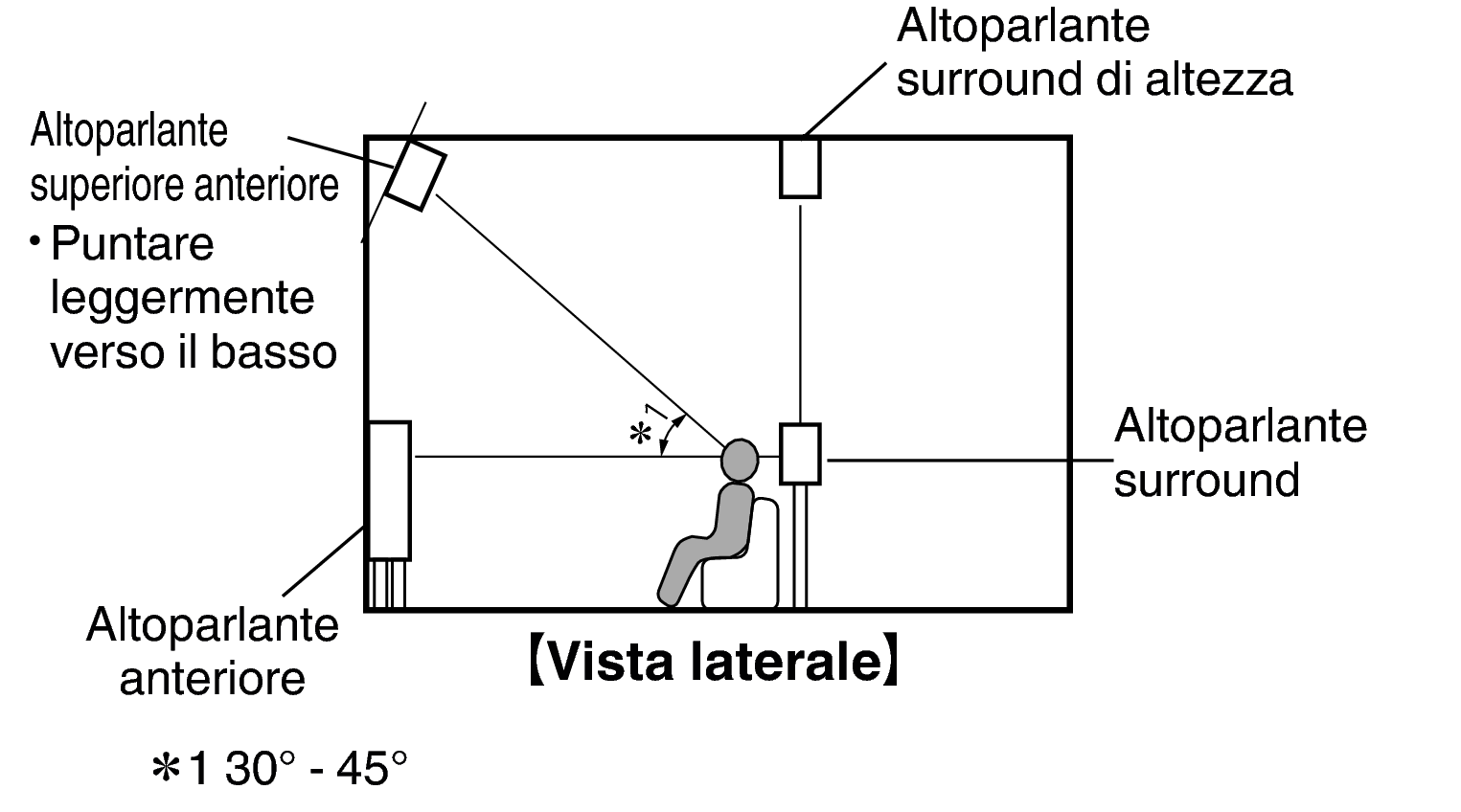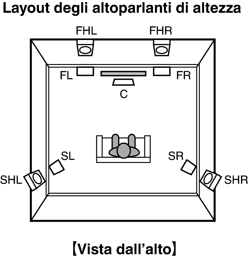 Montare gli altoparlanti TOP MIDDLE (CENTRALI SUPERIORI) sinistro e destro direttamente sopra la posizione di ascolto principale e allineati con gli altoparlanti anteriori sinistro e destro. |