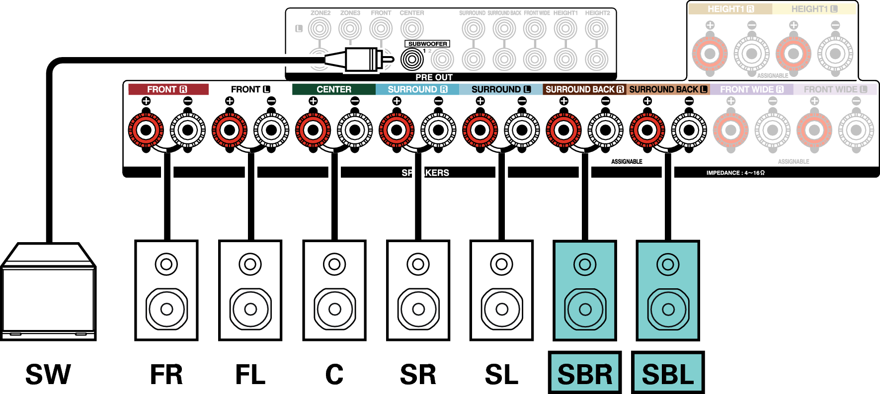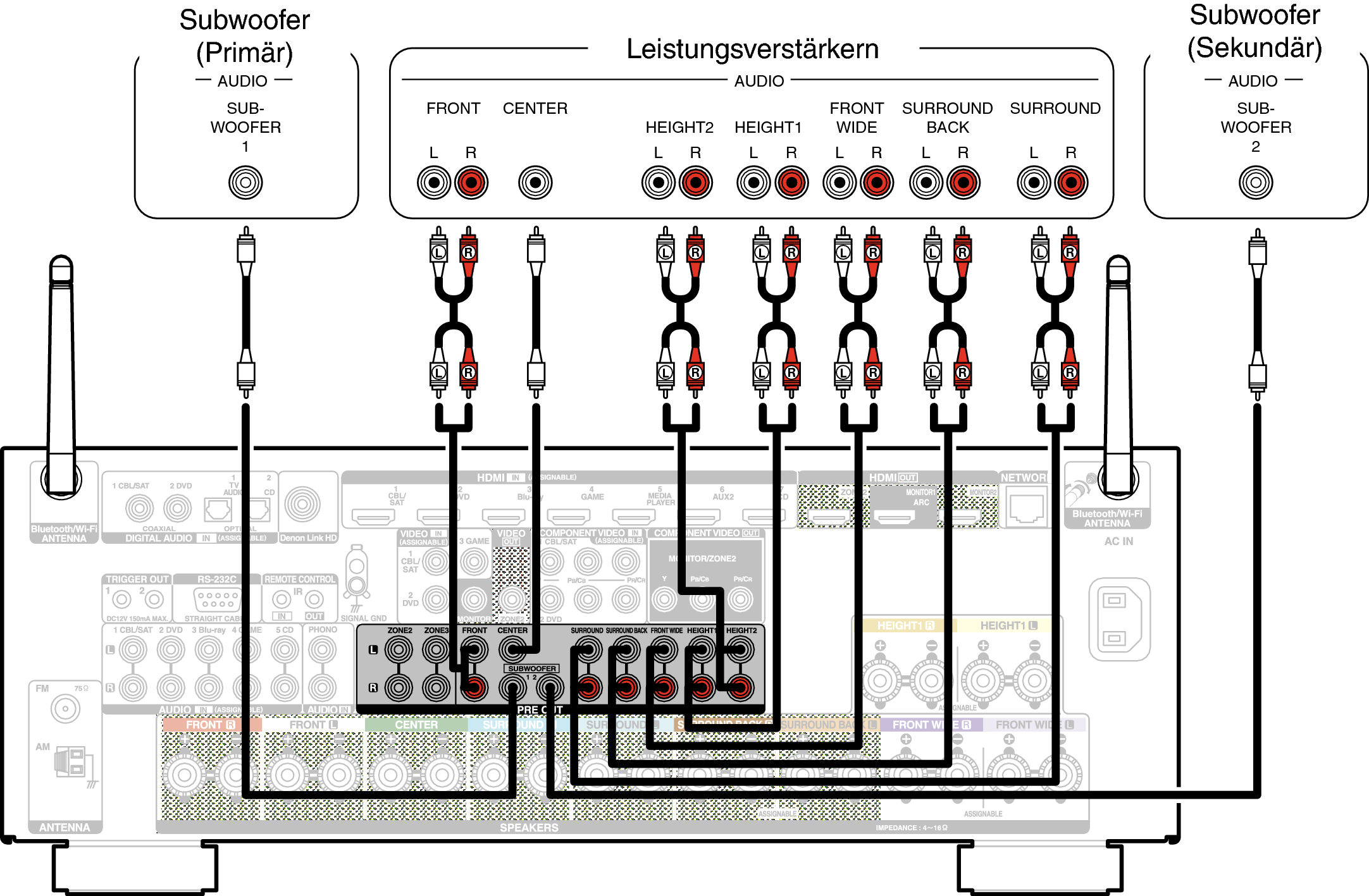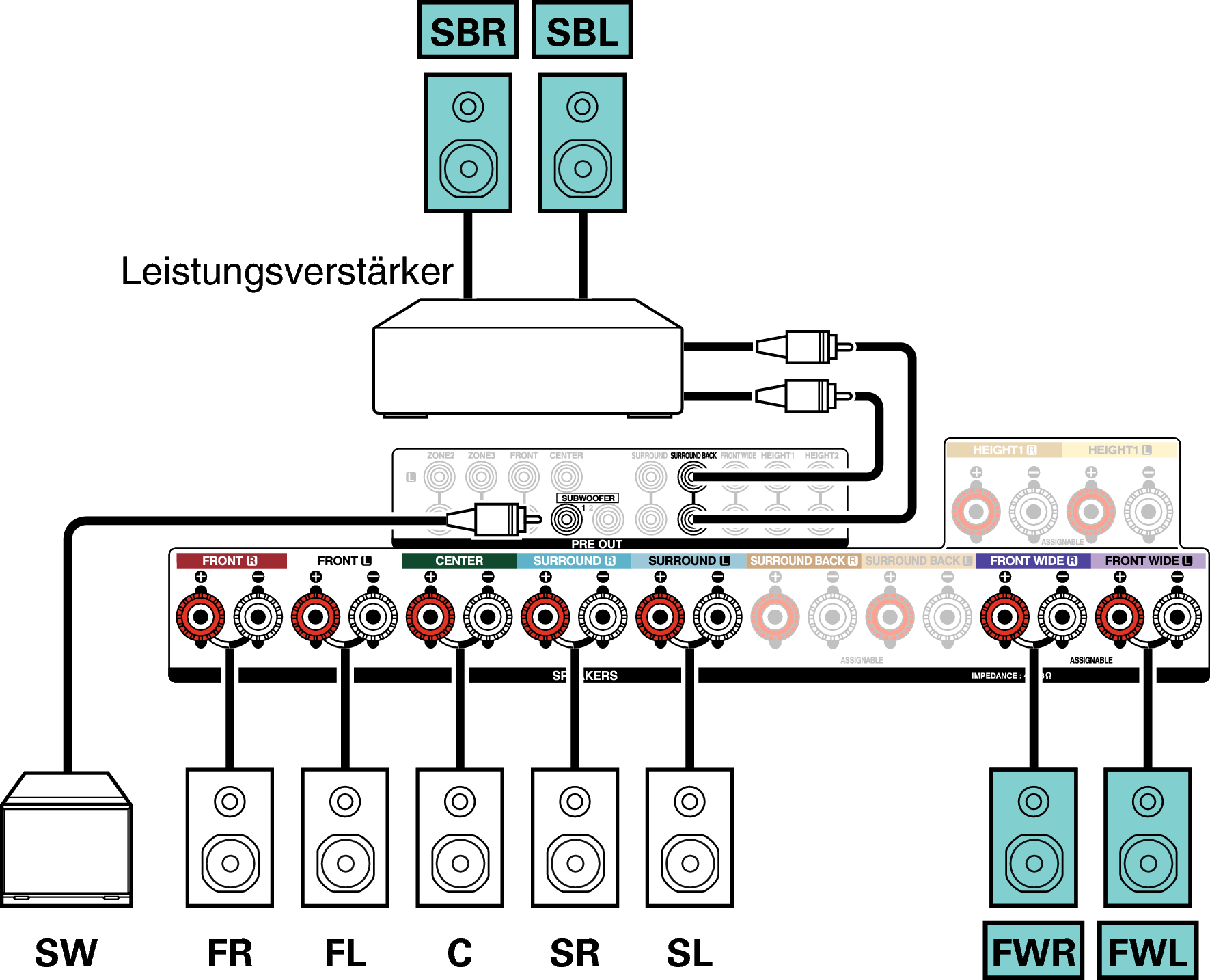 Beispielanschluss bei Verwendung der Surround-Back- und Front-Wide-Lautsprecher