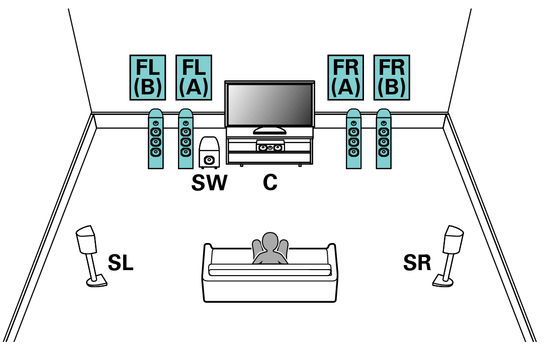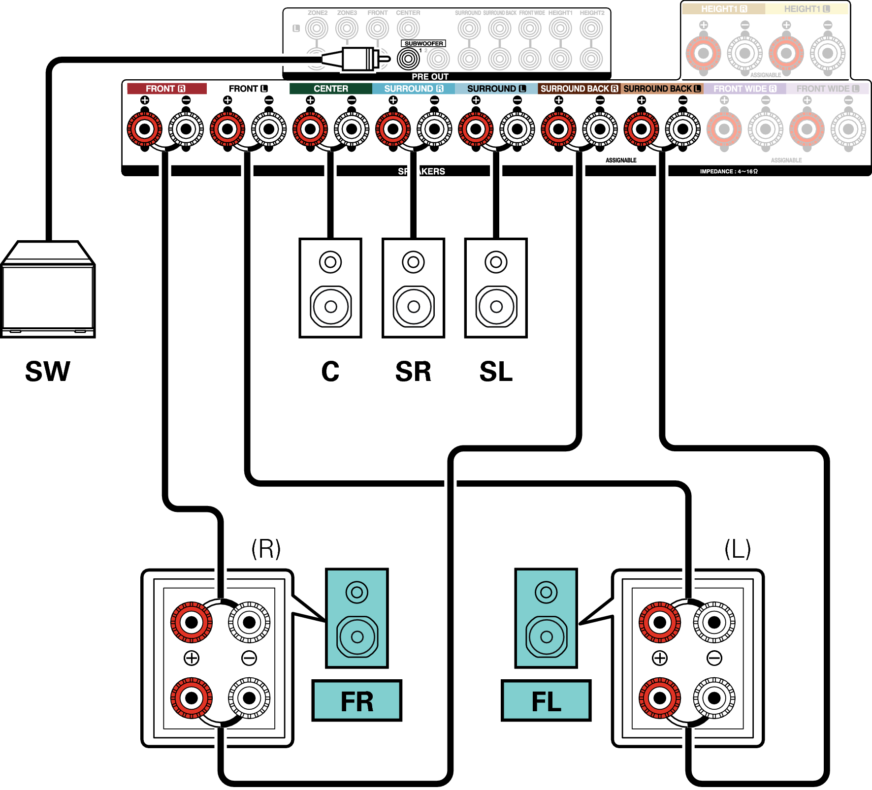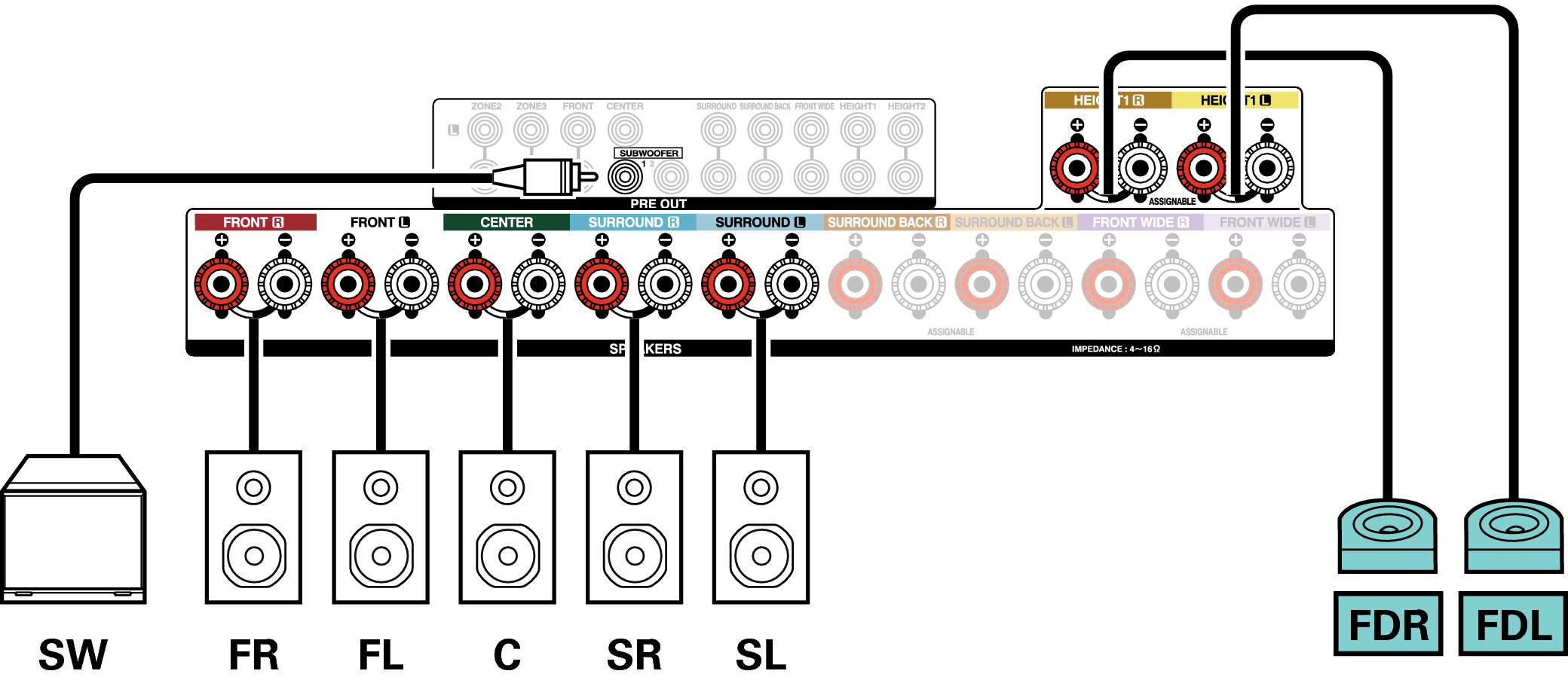 Legen Sie für “Hauptlautspr.” - “Layout” die Einstellung “5-Kan.+SB+FW” im Menü fest, wenn Sie diese Konfiguration für die Anschlüsse verwenden. Link
