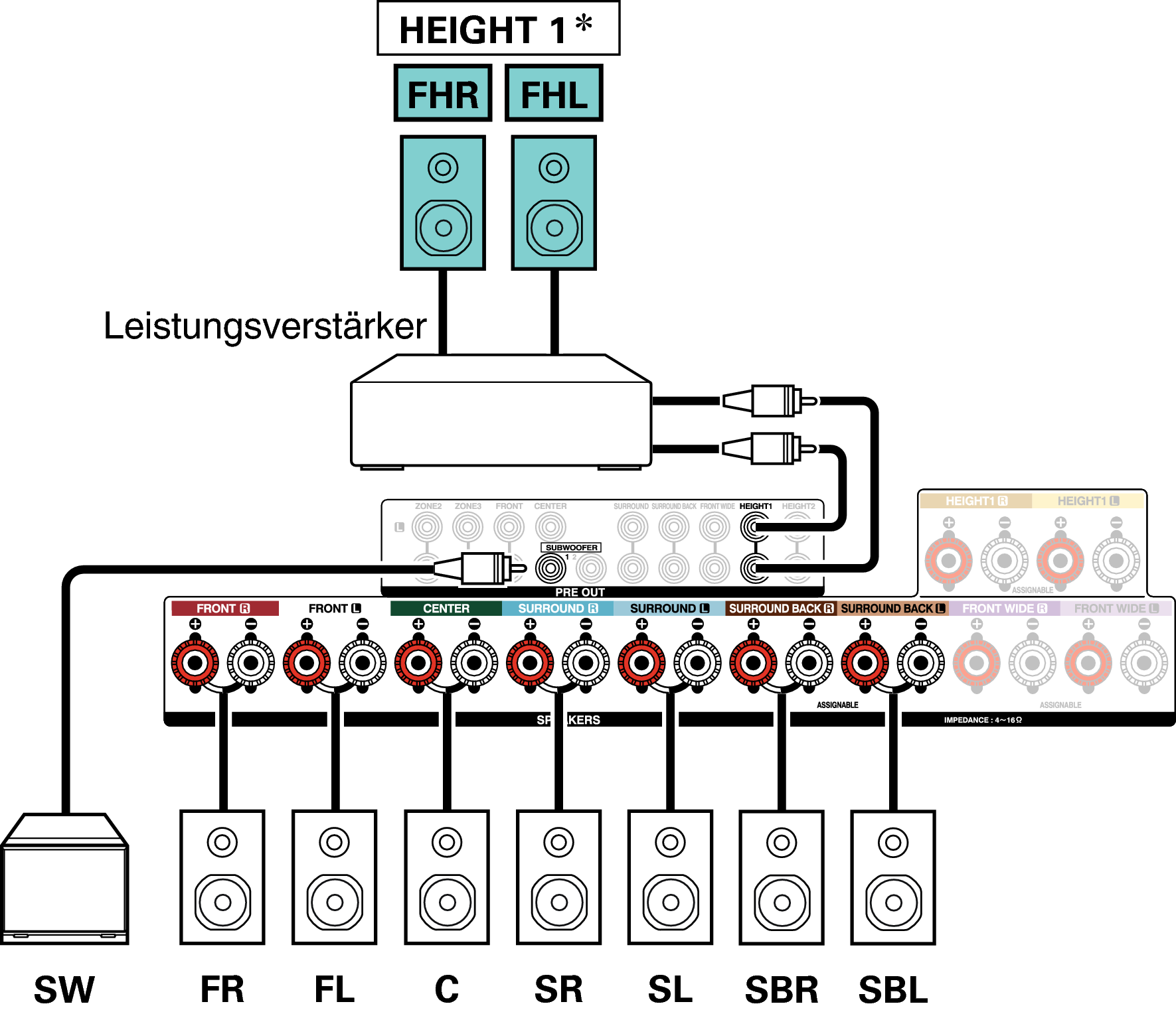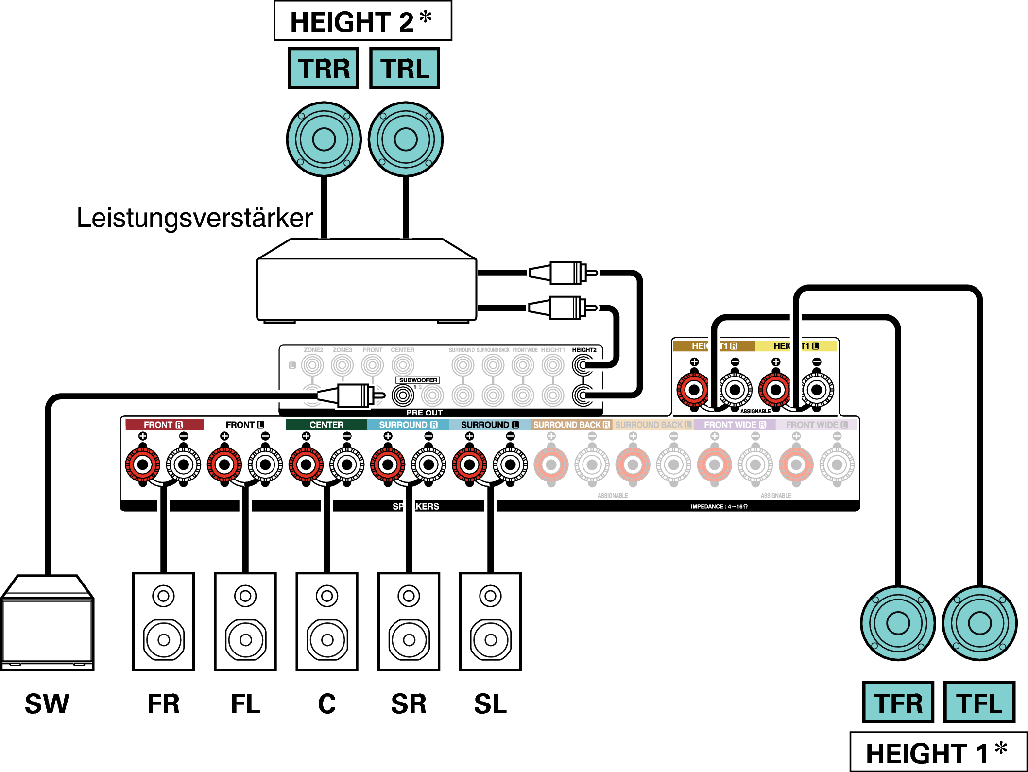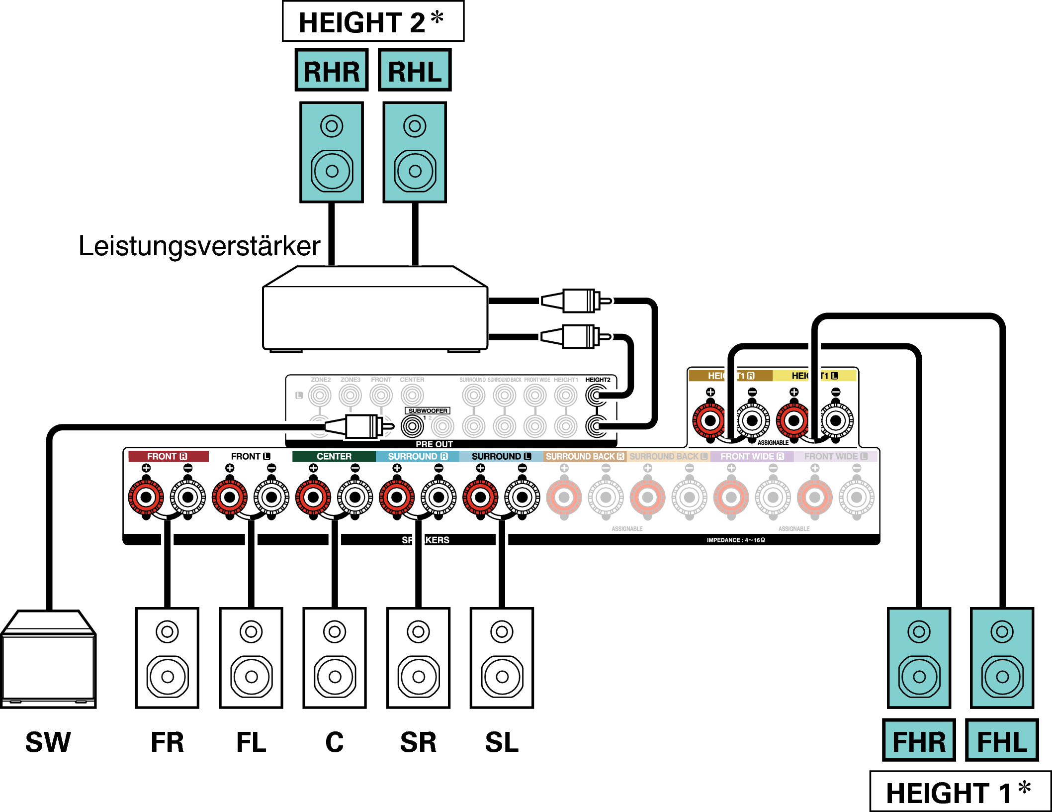Anstelle der Fronthochtöner können die Rear-Height-Lautsprecher angeschlossen werden. Legen Sie in diesem Fall unter “Height” - “Layout” im Menü die anzuschließenden Hochtöner (Height-Lautsprecher) fest. Link