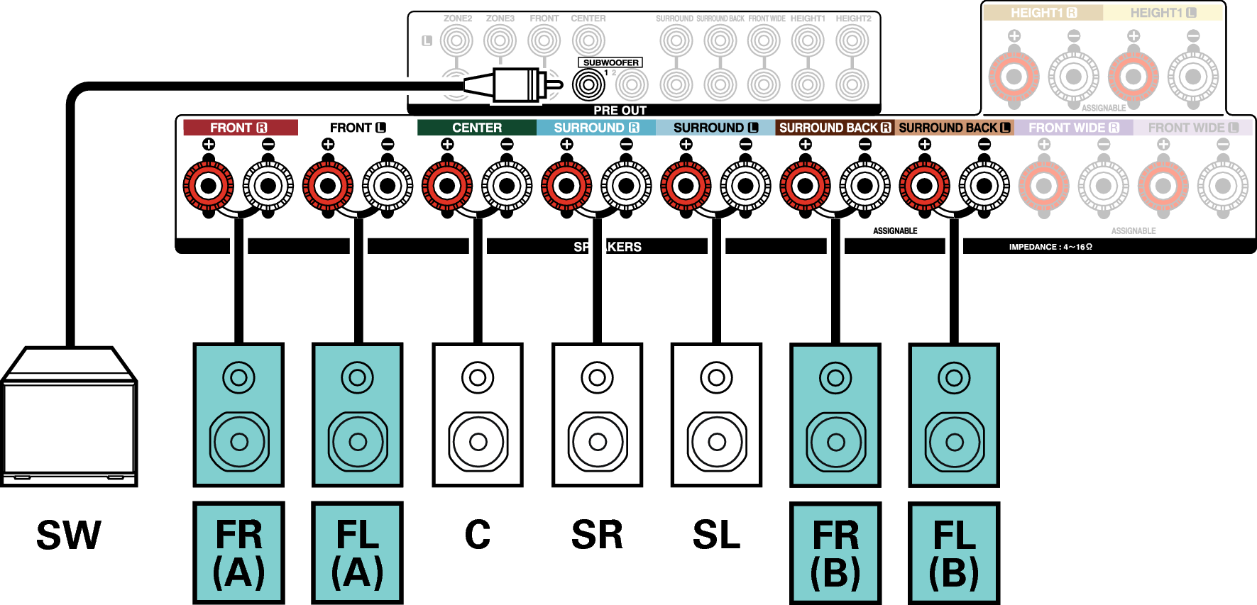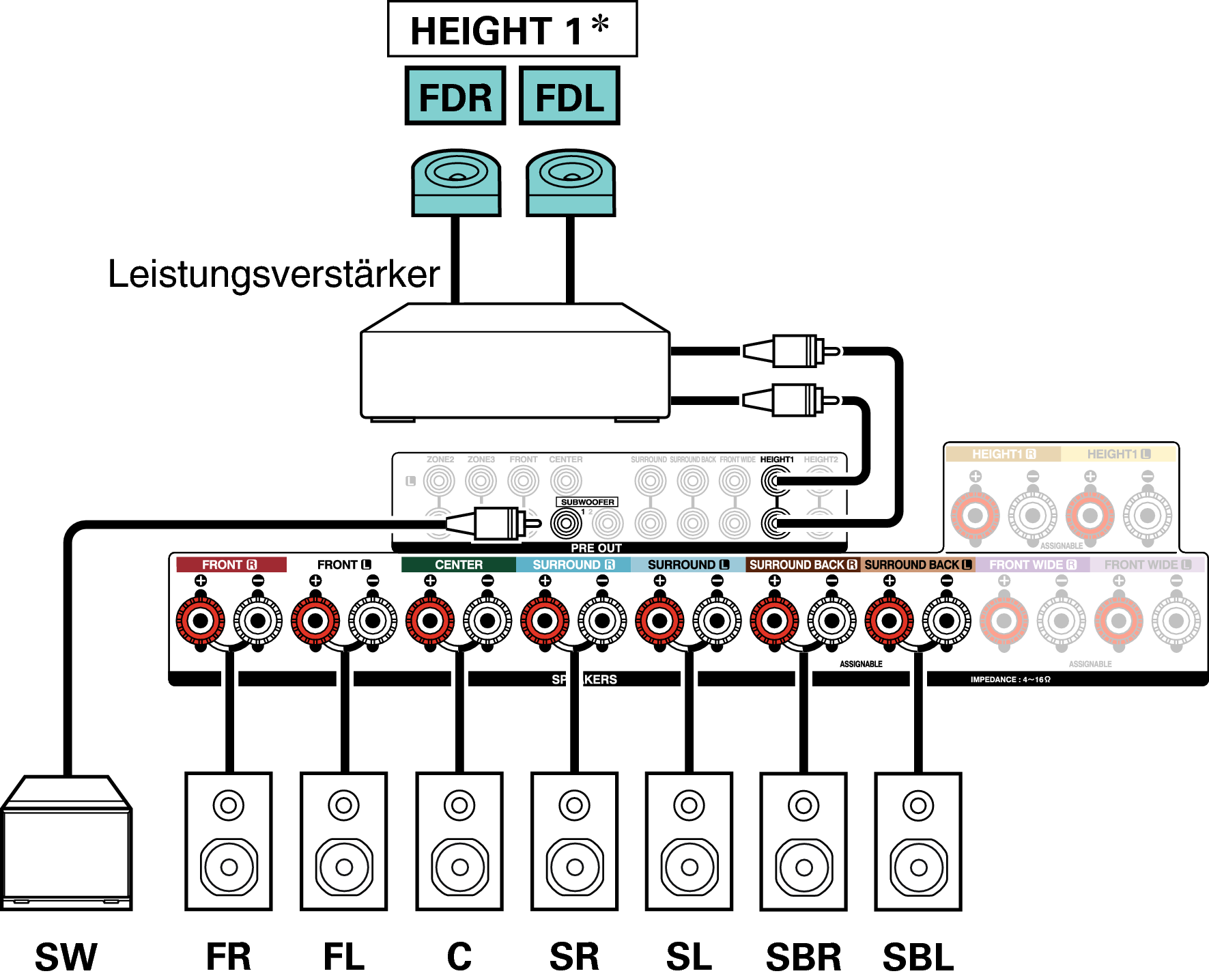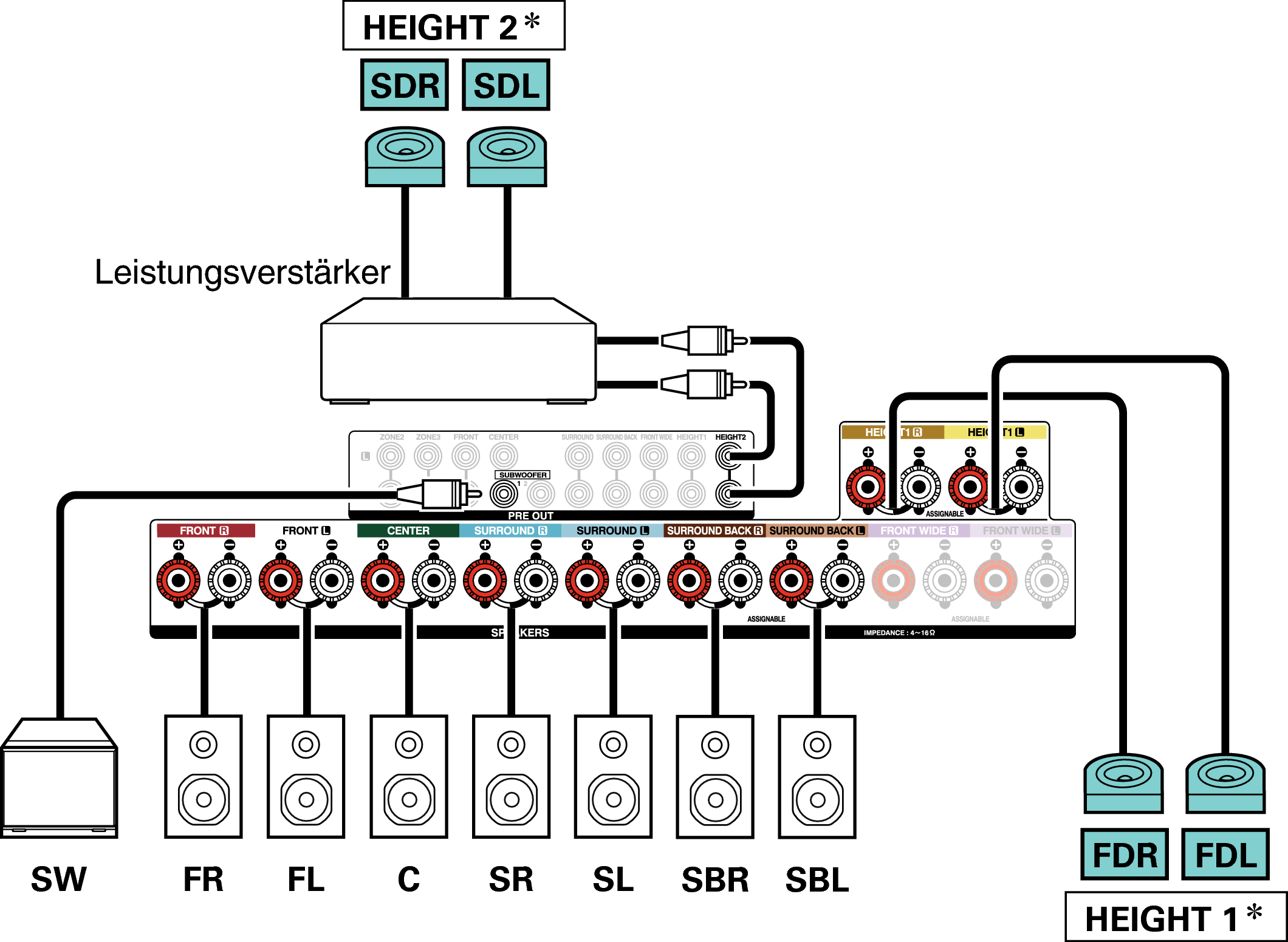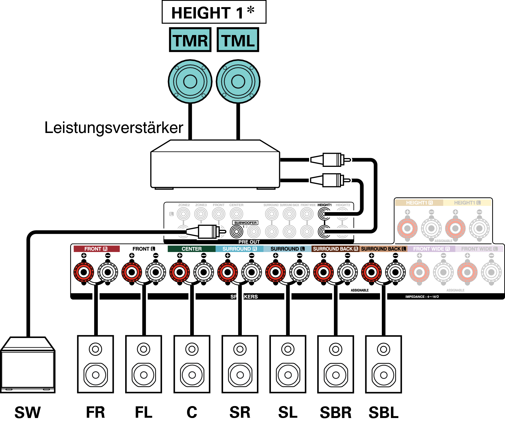 Anstelle der Fronthochtöner können die Rear-Height-Lautsprecher angeschlossen werden. Legen Sie in diesem Fall unter “Height” - “Layout” im Menü die anzuschließenden Hochtöner (Height-Lautsprecher) fest. Link