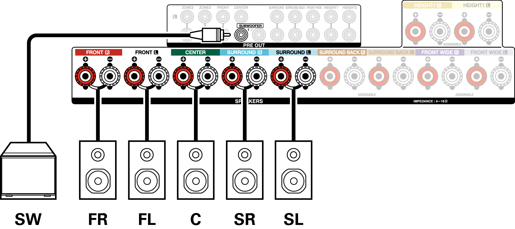 Legen Sie für “Hauptlautspr.” - “Layout” die Einstellung “5-Kan.+SB+FW” oder “5-Kan.+SB” im Menü fest, wenn Sie diese Konfiguration für die Anschlüsse verwenden. Link