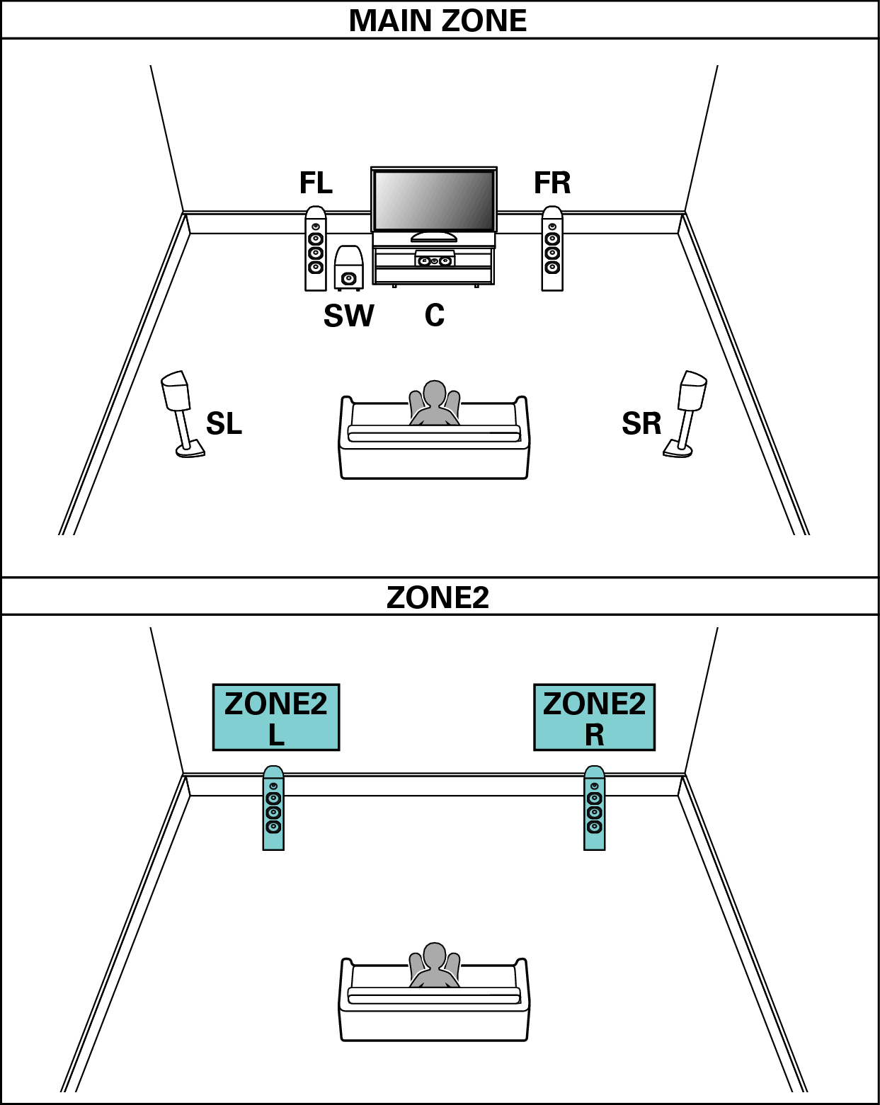 Bei dieser Konfiguration erfolgt eine 5.1-Kanal-Wiedergabe in der MAIN ZONE und eine 2-Kanal-Wiedergabe in ZONE2.