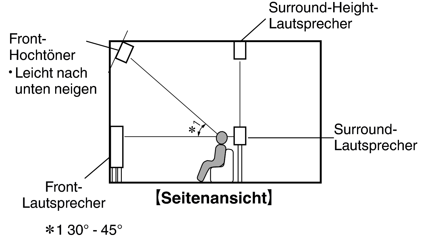 Platzieren Sie den linken und rechten Fronthochtöner direkt oberhalb der Front-Lautsprecher. Befestigen Sie diese so dicht wie möglich unter der Decke, und richten Sie sie auf die Haupthörposition aus. |