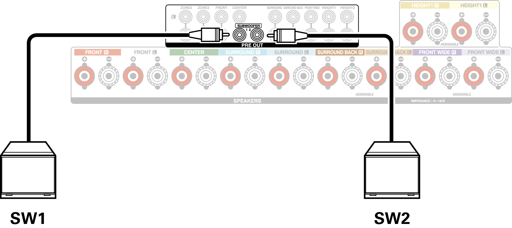 Verwenden Sie zum Anschließen des Subwoofers ein Subwoofer-Kabel. An dieses Gerät können zwei Subwoofer angeschlossen werden.