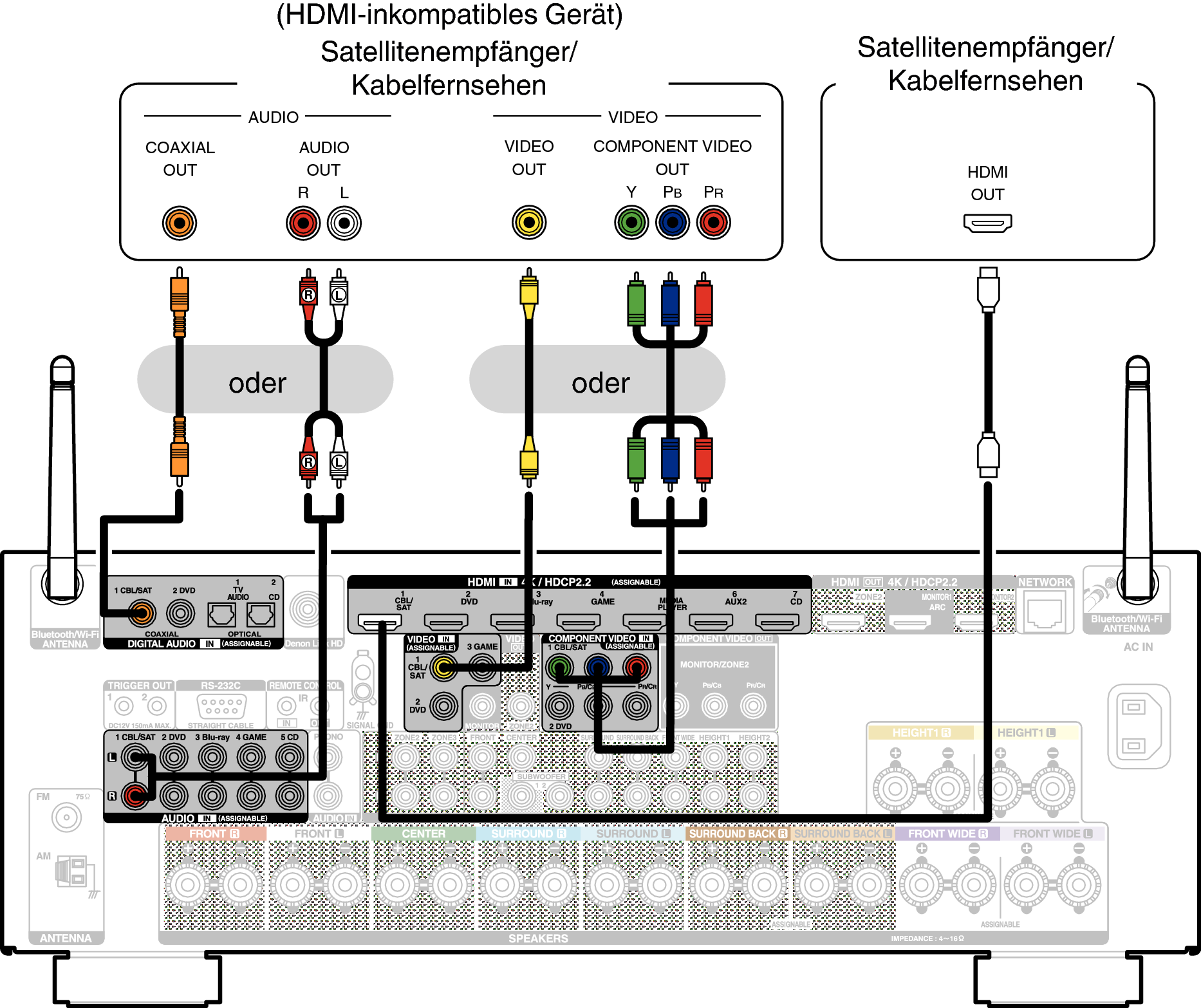 In diesem Beispiel wird der Anschluss einer Satellitenempfänger-/Kabelfernsehen-STB erläutert.