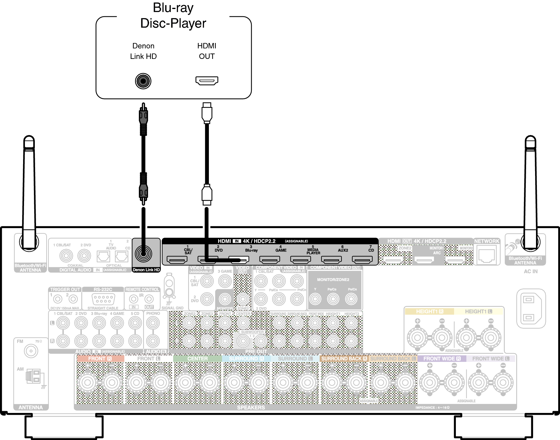 Wenn Sie einen Player, der mit der Denon Link HD-Funktion kompatibel ist, über den Denon Link HD-Anschluss anschließen, ist die Wiedergabequalität im Vergleich zu einem reinen HDMI-Anschluss besser.
