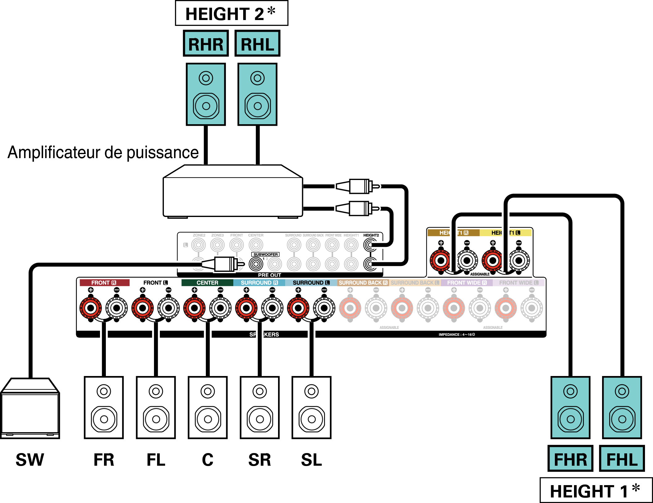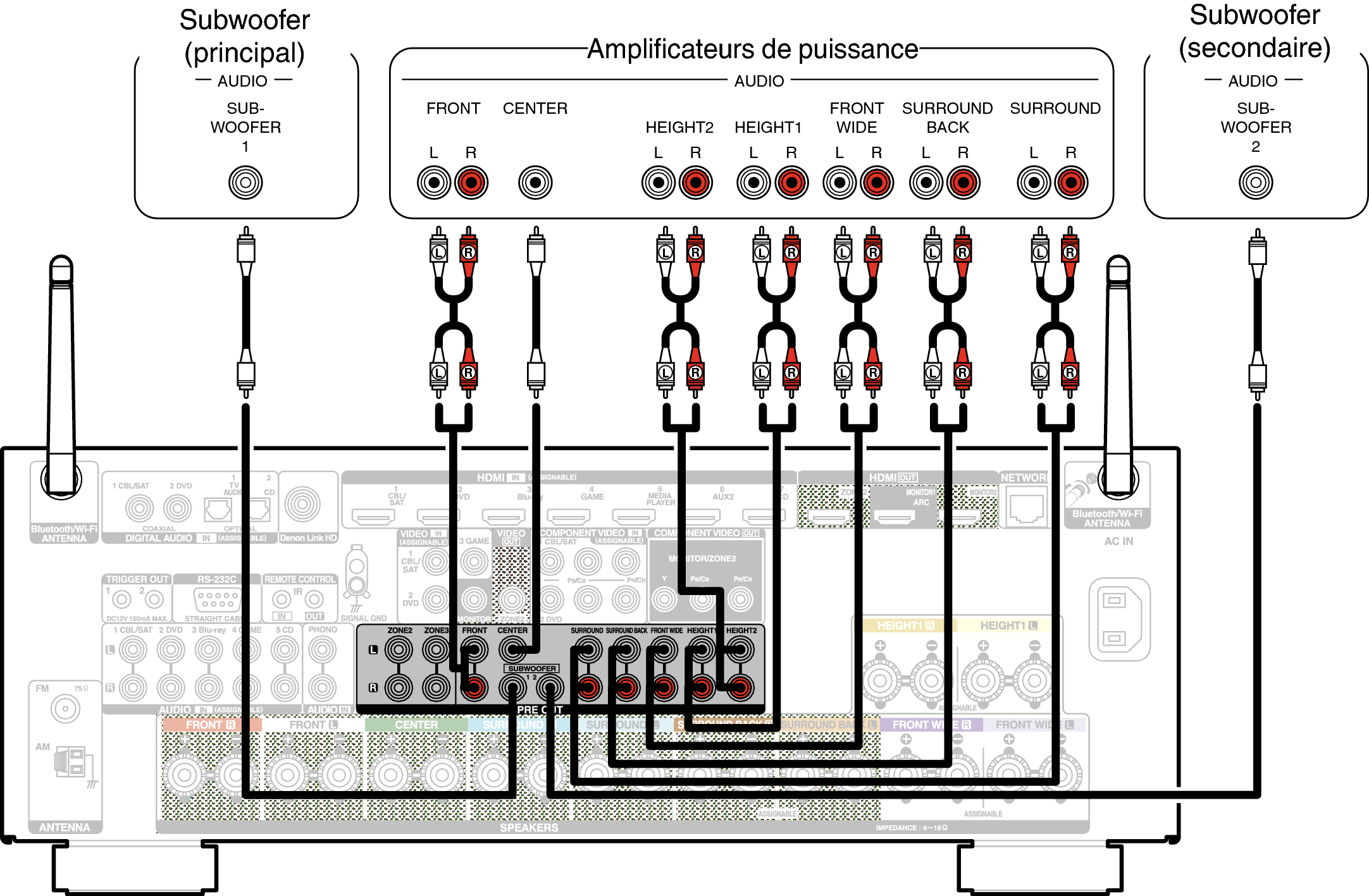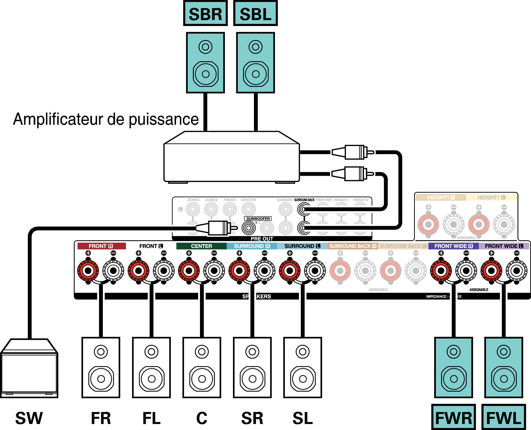 Exemple de connexion avec utilisation d’enceintes surround arrière et larges avant