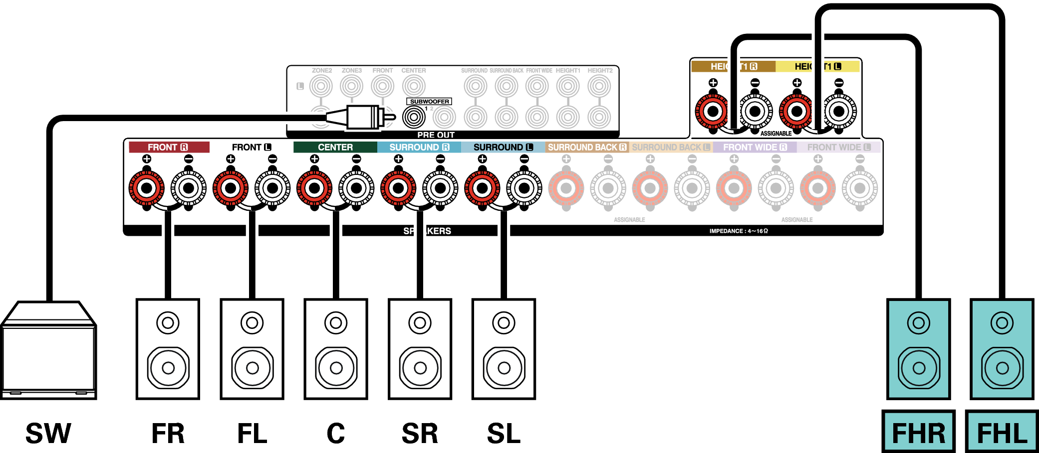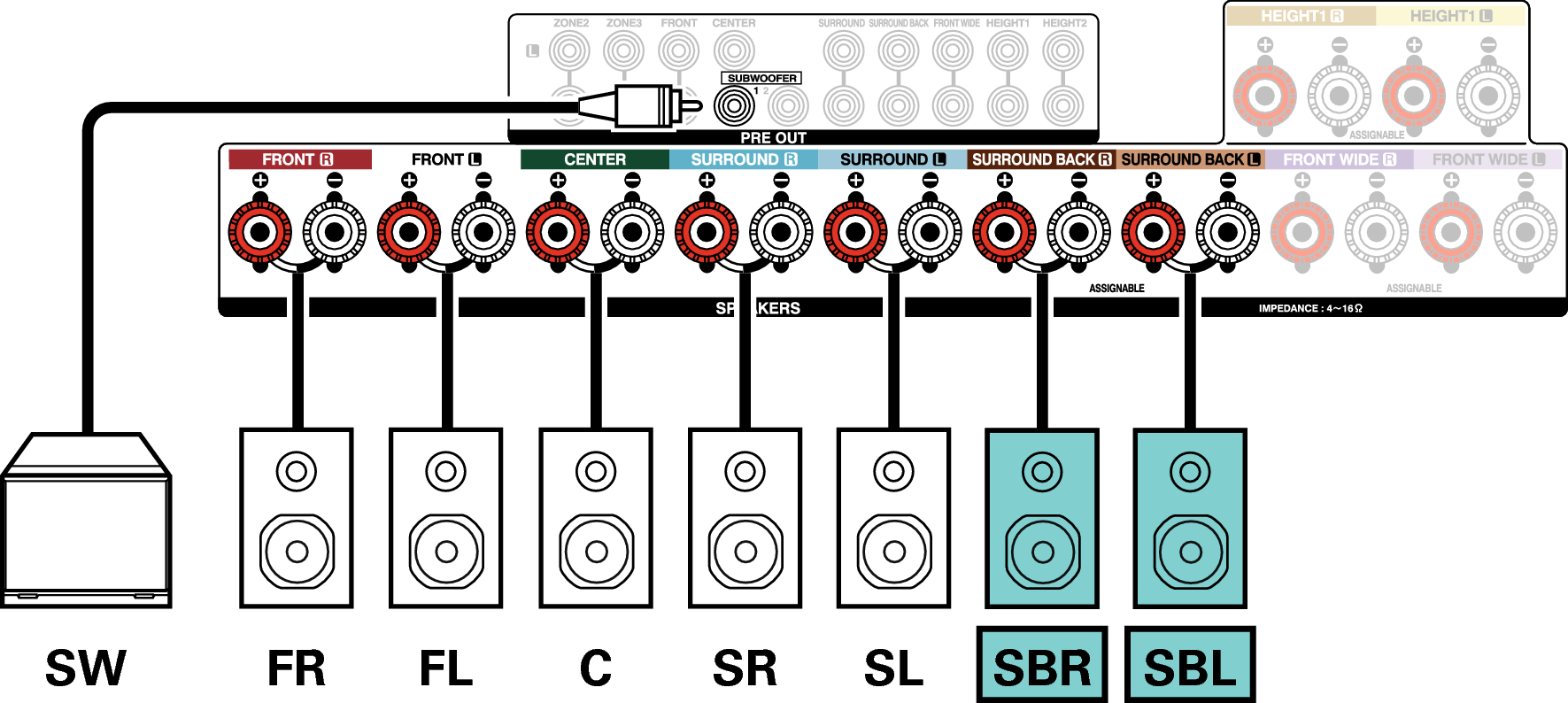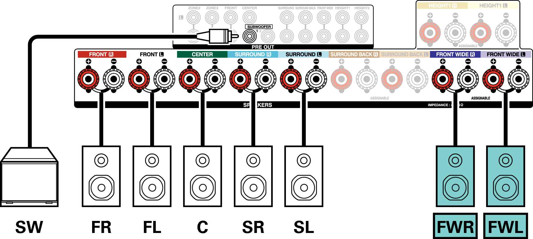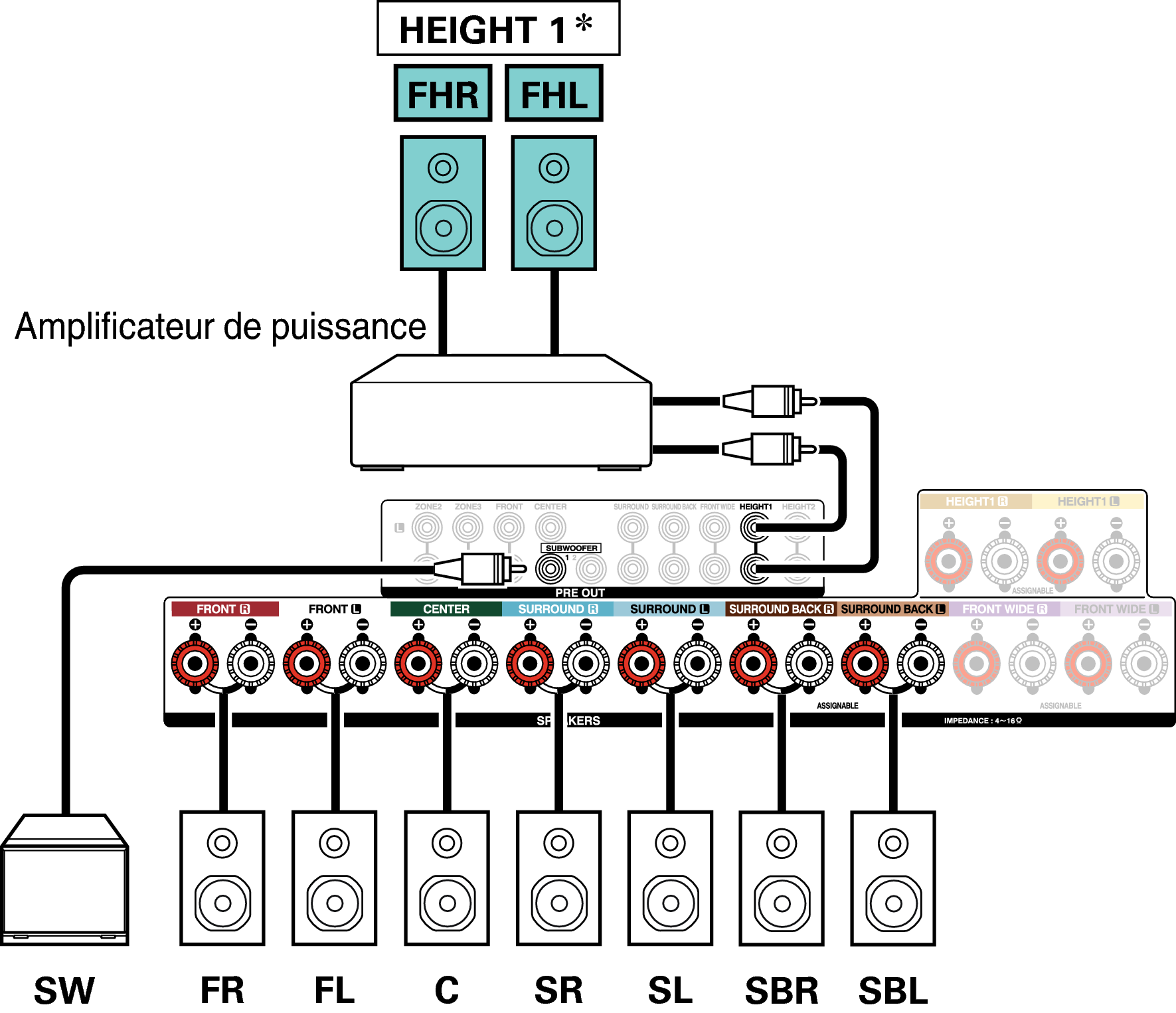 Exemple de connexion avec utilisation d’enceintes surround arrière et larges avant