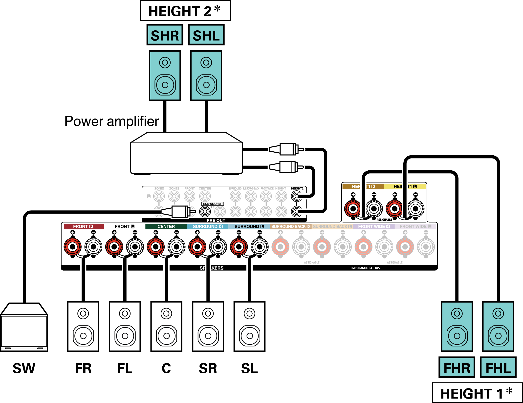La combinaison des canaux HEIGHT1 et HEIGHT2 peut être modifiée selon les modèles suivants en fonction du système d’enceintes utilisé.