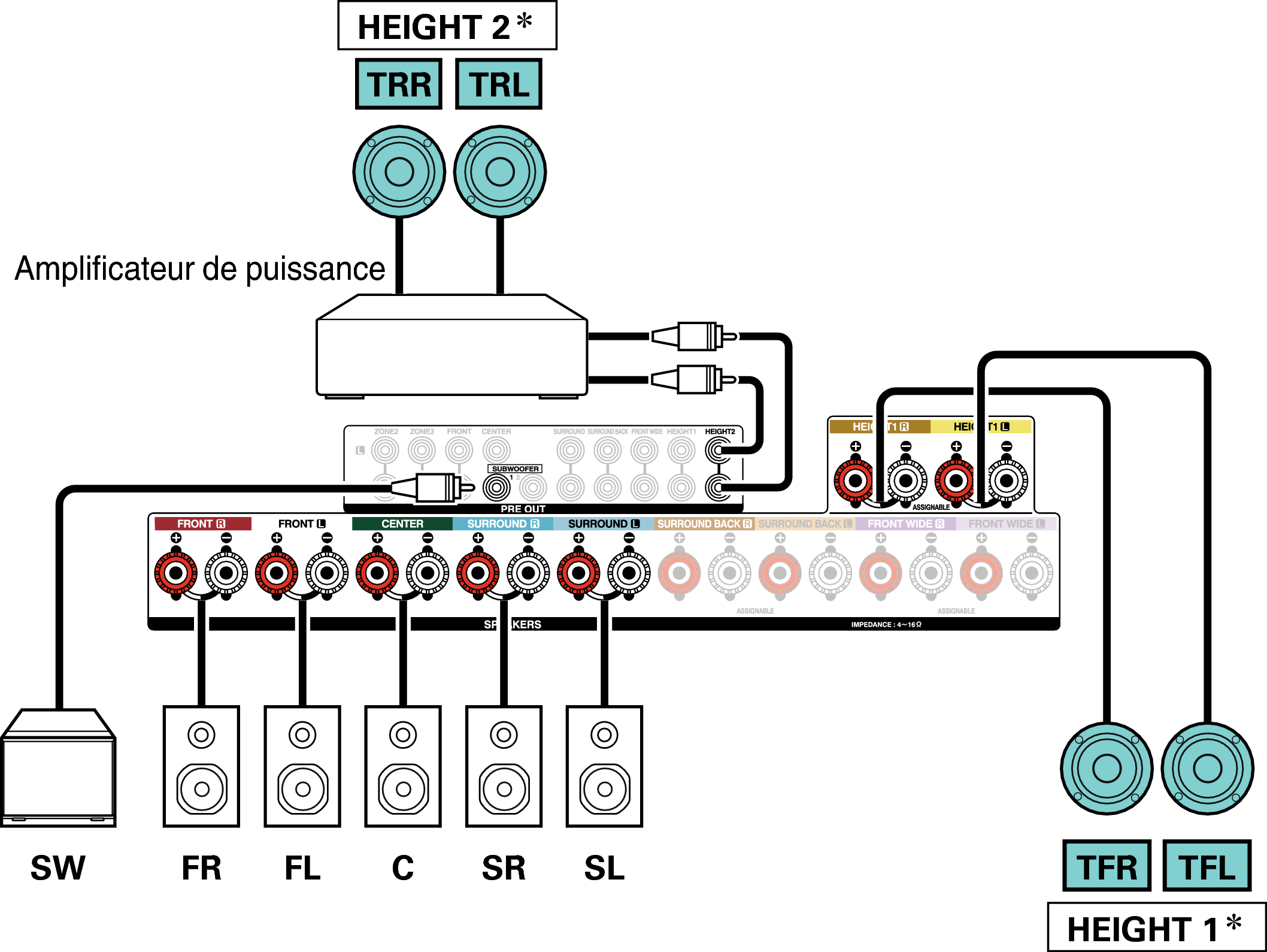 Il est possible de connecter les enceintes arrière hautes au lieu des enceintes avant hautes. Dans ce cas, réglez les enceintes hautes à connecter dans “Hauteur” - “Agencement” dans le menu. lien