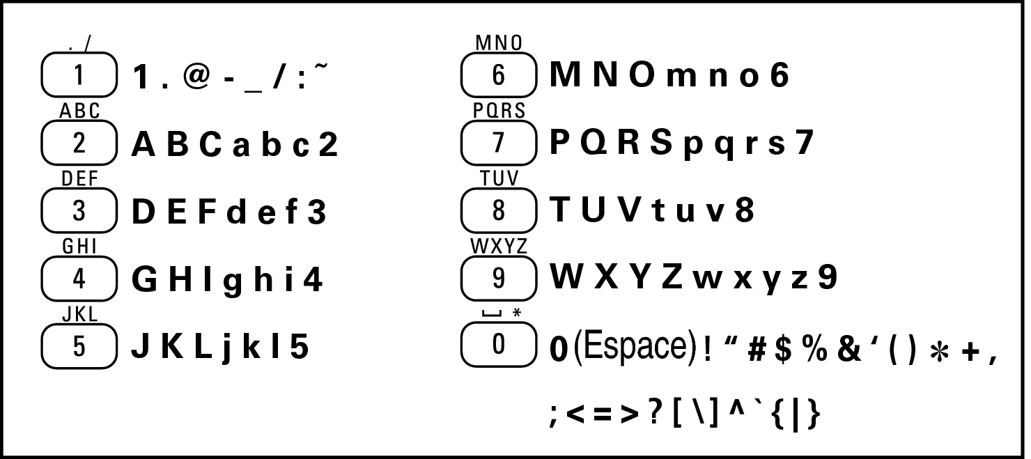 et appuyez sur la touche numérique voulue (0 – 9) jusqu’à ce que le caractère choisi s’affiche.Les types de caractères qui peuvent être saisis sont indiqués ci-dessous.