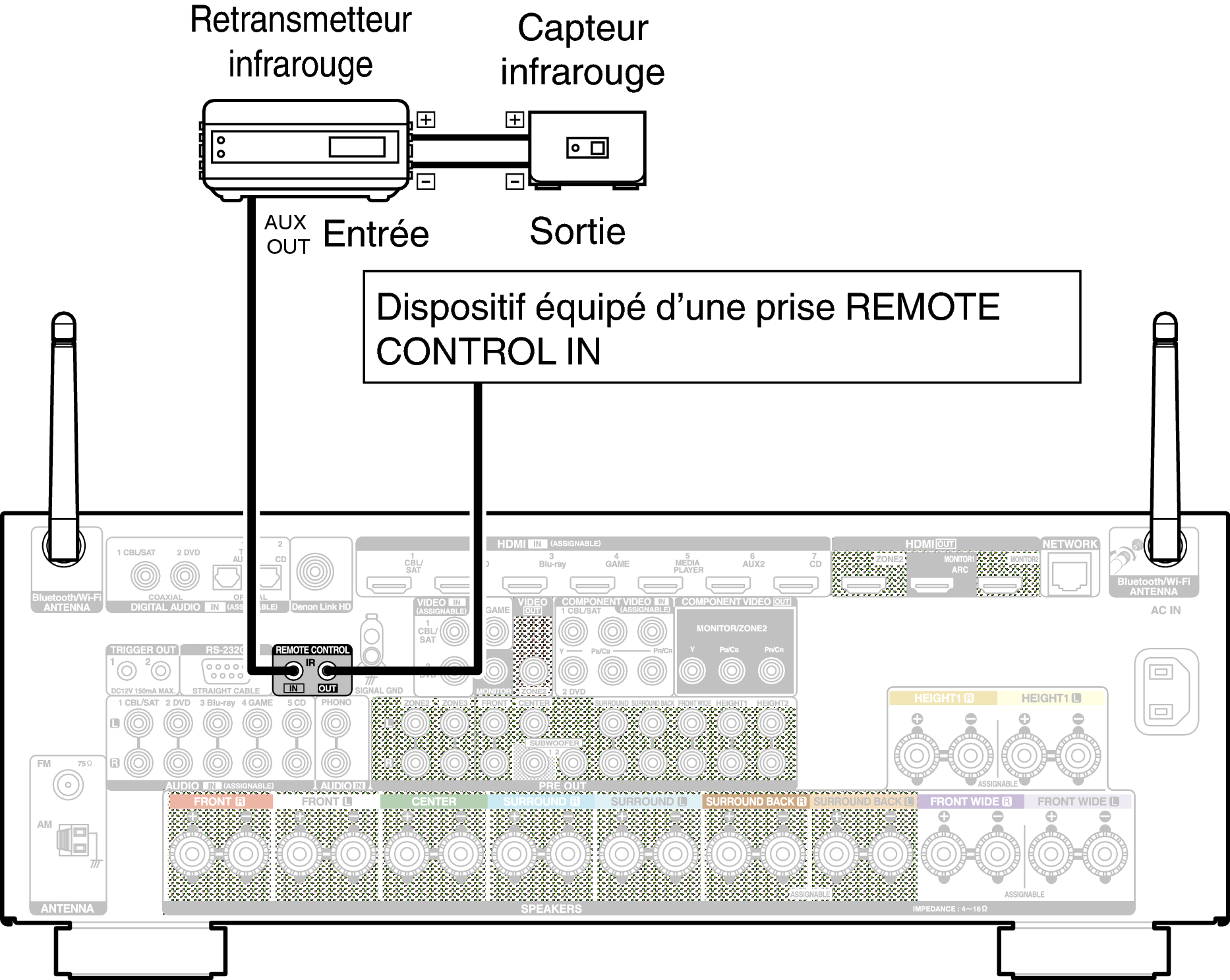 Lorsque cet appareil est installé dans un endroit où les signaux de la télécommande ne peuvent pas atteindre (installation dans un placard, etc.), il peut toujours être contrôlé par la télécommande en connectant un récepteur de télécommande (vendu séparément).