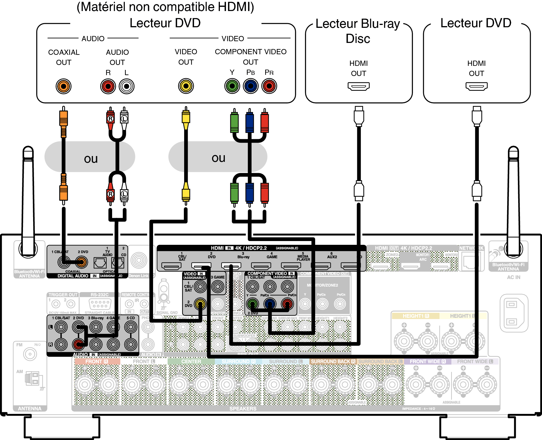 Lors de la connexion d’un lecteur de disques Blu-ray compatible avec Denon Link HD, voir “Connexion d’un lecteur Blu-ray Disc compatible avec la fonction Denon Link HD” lien.