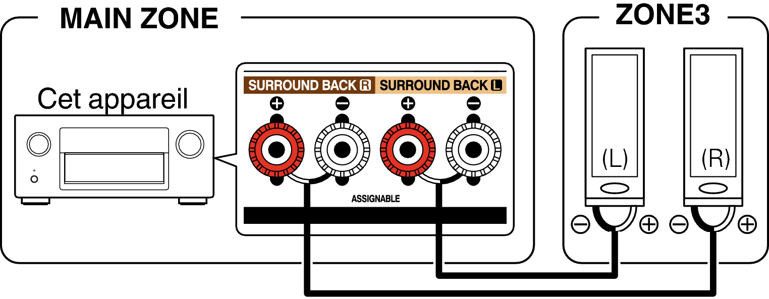Les signaux audio des bornes de sortie audio des ZONE2 et ZONE3 de cet appareil sont émis vers les amplificateurs des ZONE2 et ZONE3 et sont lus sur ces mêmes amplificateurs.