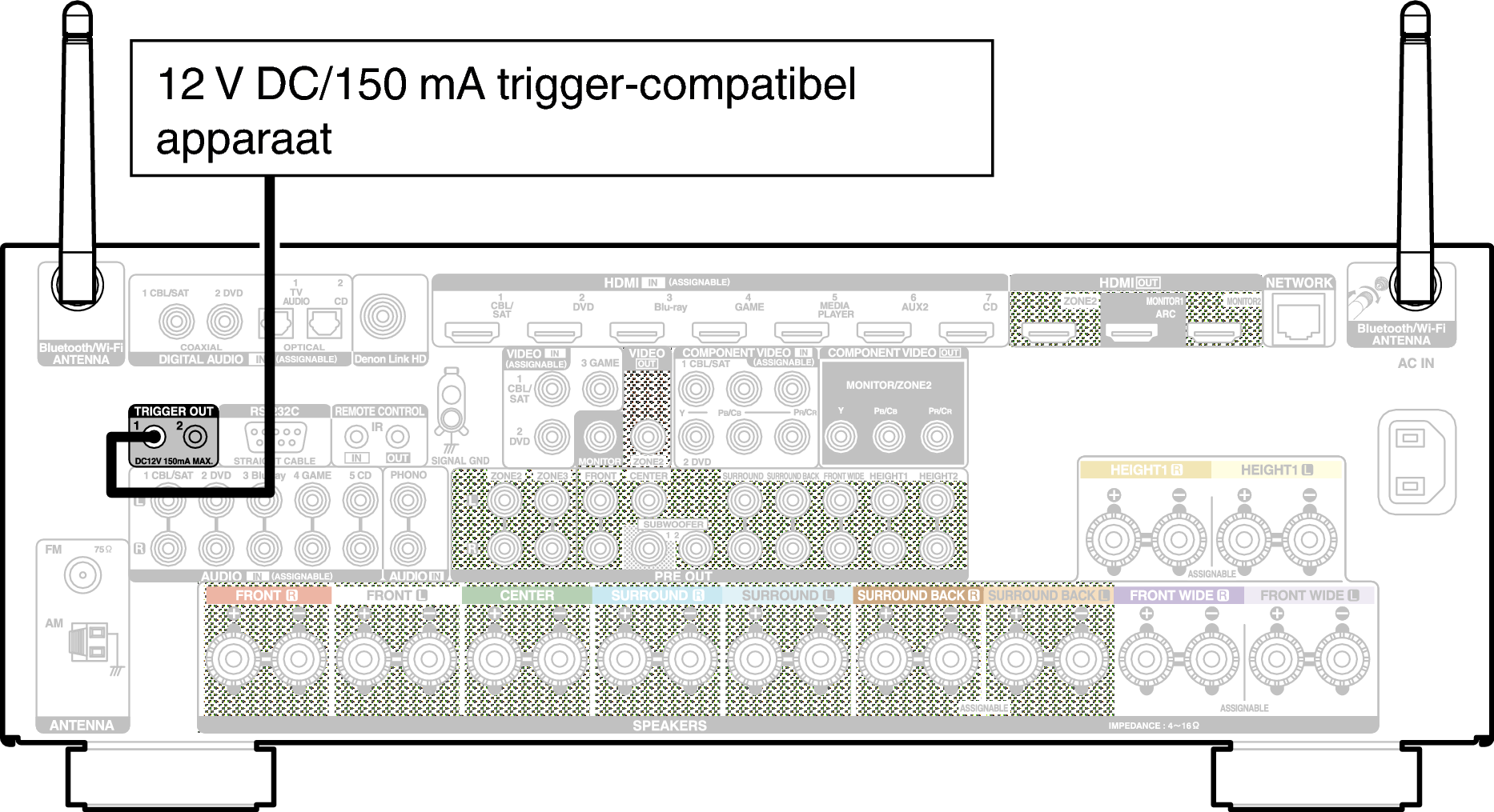 De TRIGGER OUT-aansluiting stuurt een elektrisch signaal uit van maximaal 12 V DC/150 mA.