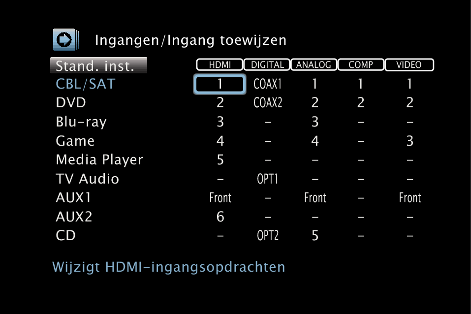 Wijzig de toewijzing van de HDMI-ingang, digitale audio-ingang, analoge audio-ingang, component video-ingang en video-ingang wanneer een ingangsbron wordt aangesloten die verschilt van deze die naar de audio-/video-ingangen van dit toestel wordt ingevoerd.