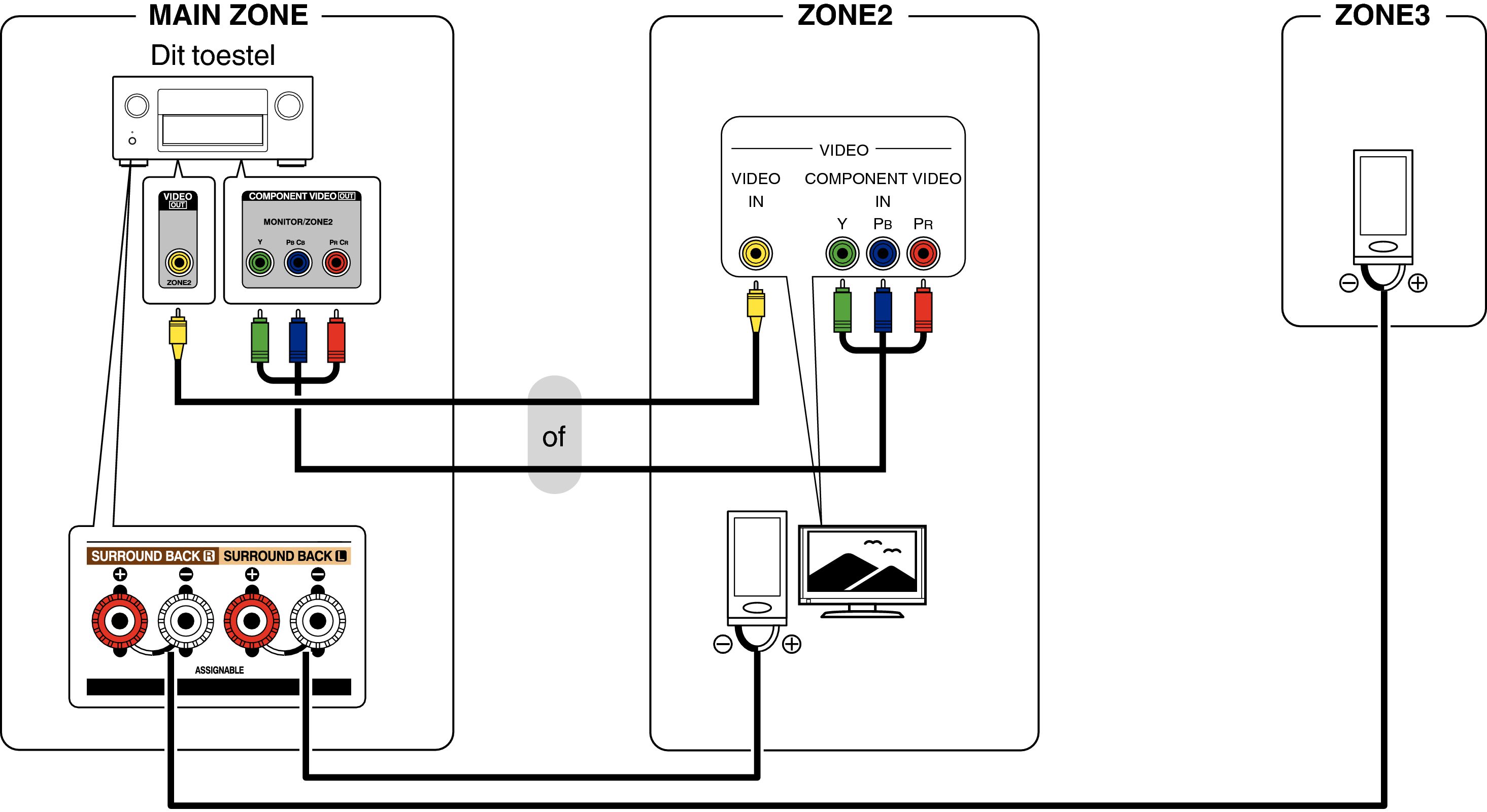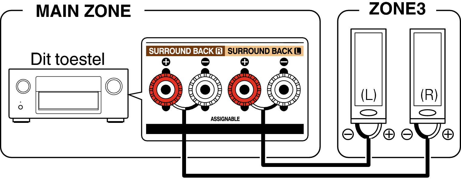 De audiosignalen van de ZONE2- en ZONE3-audio-uitgangen van dit toestel worden uitgevoerd naar de ZONE2- en ZONE3-versterkers en afgespeeld via deze versterkers.
