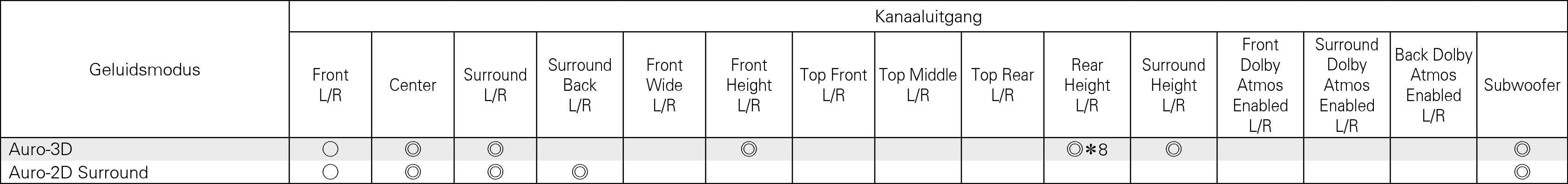 Voor de beste Auro-3D-ervaring zijn surround hoog luidsprekers aanbevolen, maar u kunt ze wel vervangen door achter hoog luidsprekers van een Dolby Atmos-luidsprekersysteem in plaats van surround hoog-luidsprekers.