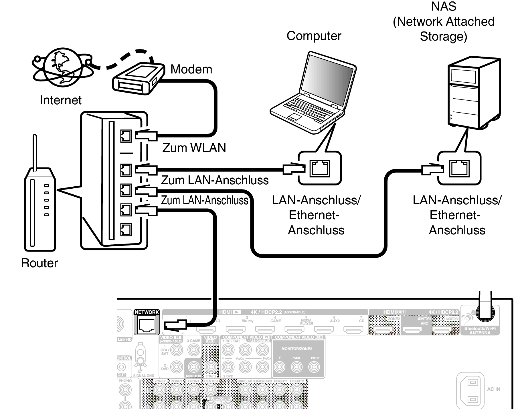 Für den Anschluss über ein kabelgebundenes LAN verbinden Sie den Router über ein LAN-Kabel mit diesem Gerät, wie in der nachstehenden Abbildung dargestellt.