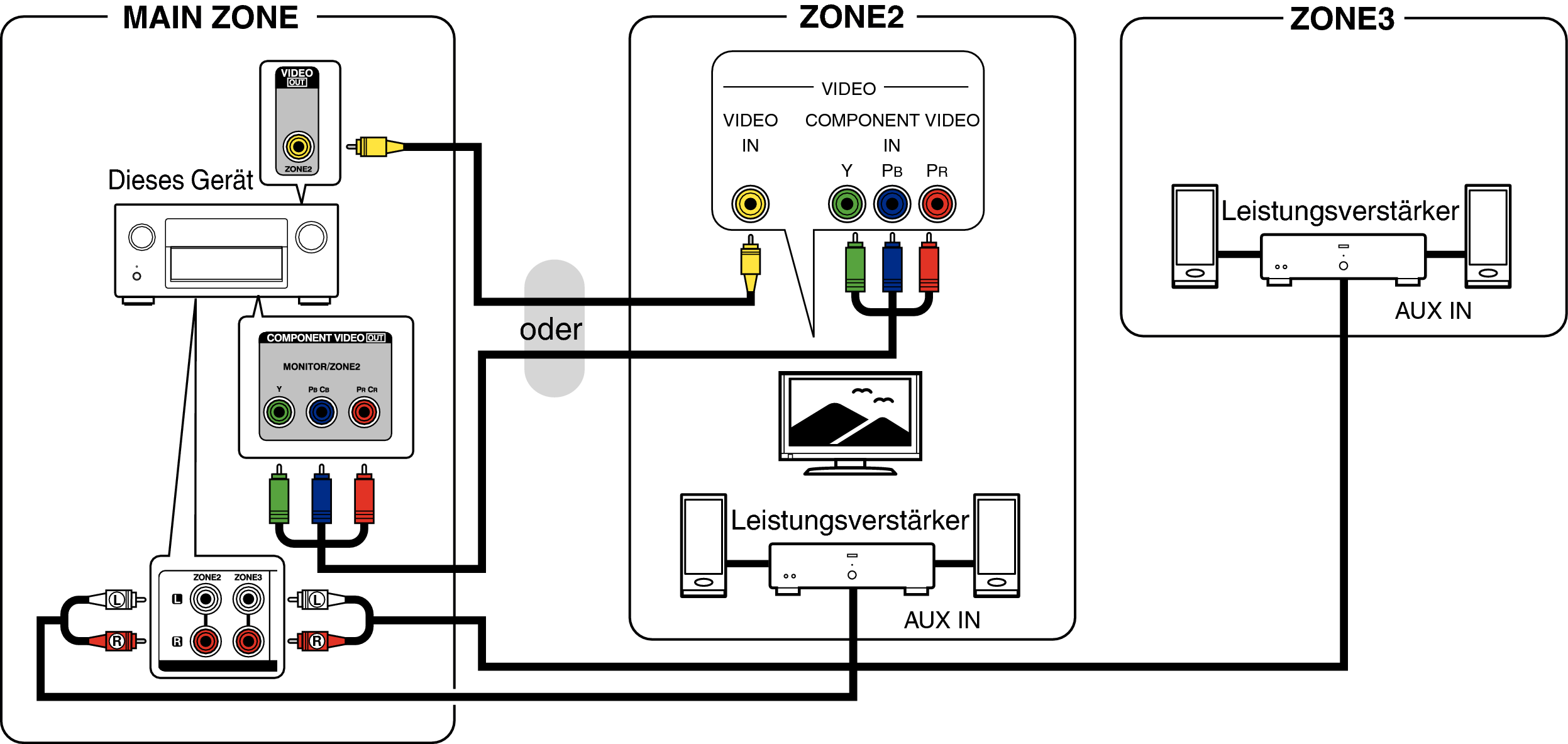 Die Audiosignale an den Audioausgängen von ZONE2 und ZONE3 des Geräts werden über die Leistungsverstärker für ZONE2 und ZONE3 ausgegeben.