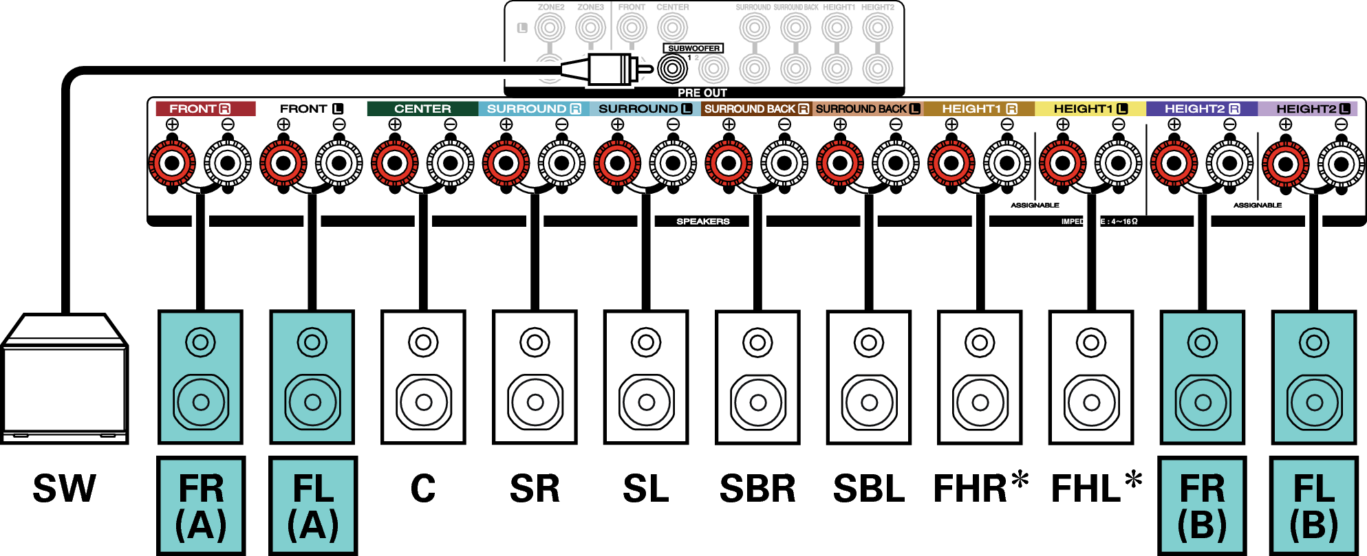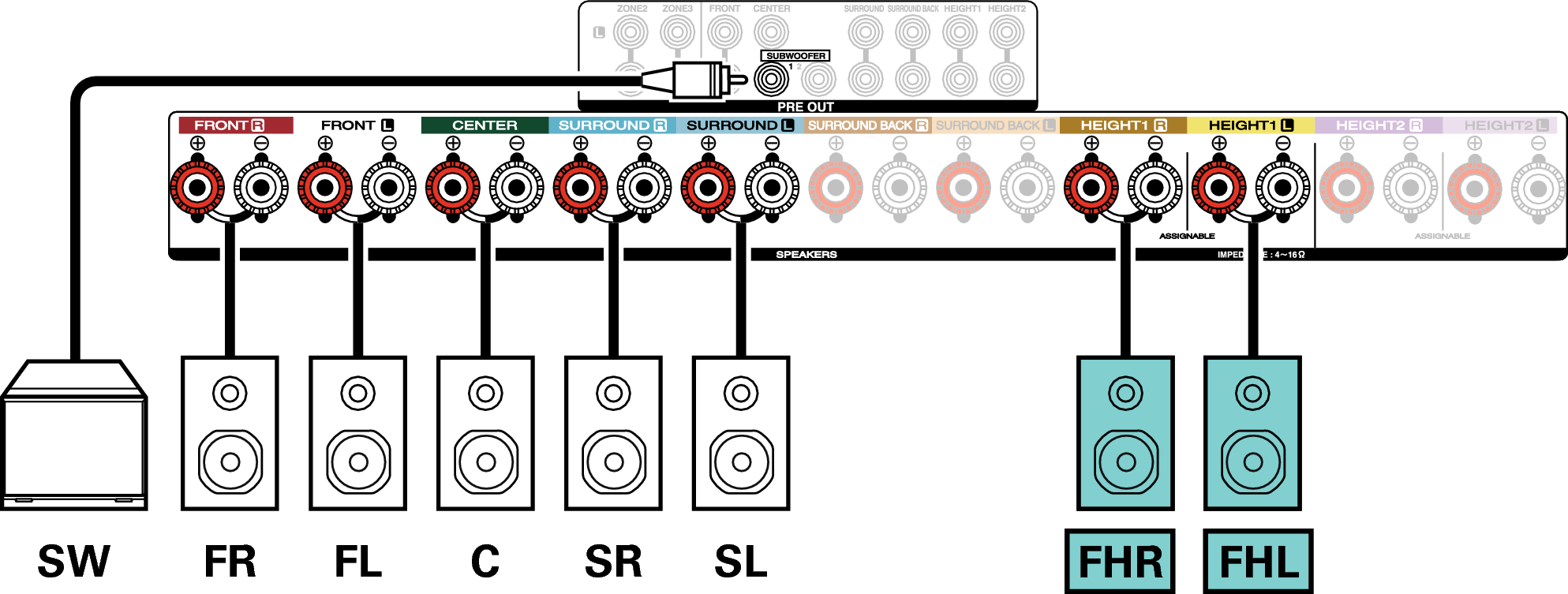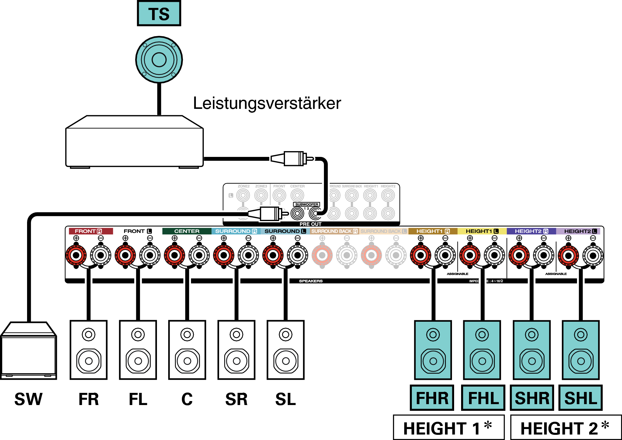 Anstelle der Fronthochtöner können die Rear-Height-Lautsprecher angeschlossen werden. Legen Sie in diesem Fall unter “Height” - “Layout” im Menü die anzuschließenden Hochtöner (Height-Lautsprecher) fest. Link