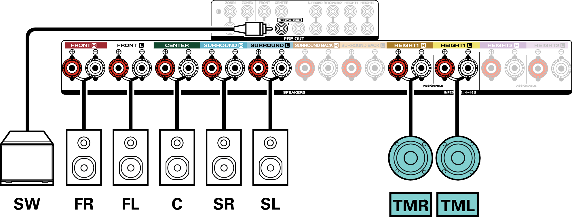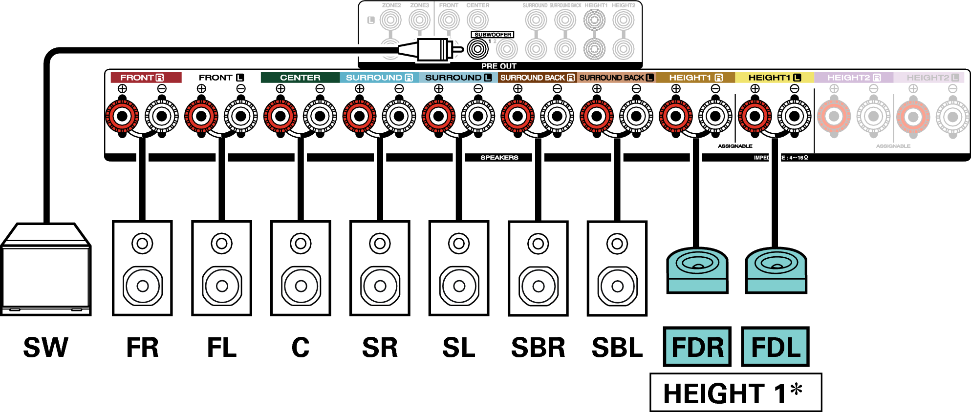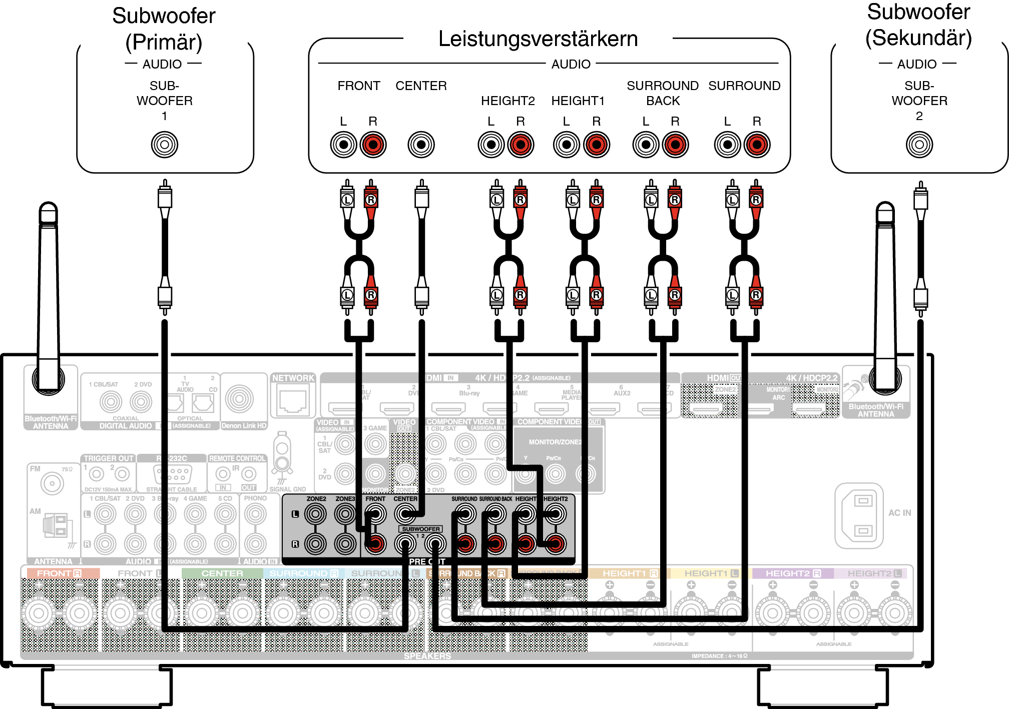 Anstelle der Fronthochtöner können die Rear-Height-Lautsprecher angeschlossen werden. Legen Sie in diesem Fall unter “Height” - “Layout” im Menü die anzuschließenden Hochtöner (Height-Lautsprecher) fest. Link
