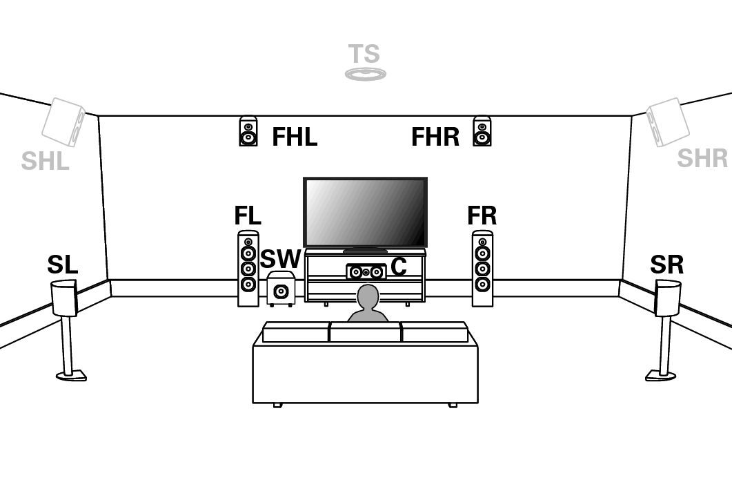 Bei Auro-3D wird ein herkömmliches 5.1-Kanal-System um Fronthochtöner (FHL+FHR), Surround-Height-Lautsprecher (SHL+SHR) und Top-Surround-Lautsprecher (TS/optional) ergänzt – so erhalten Sie ein natürliches und realitätsnahes dreidimensionales und vollumfassendes Klangfeld.