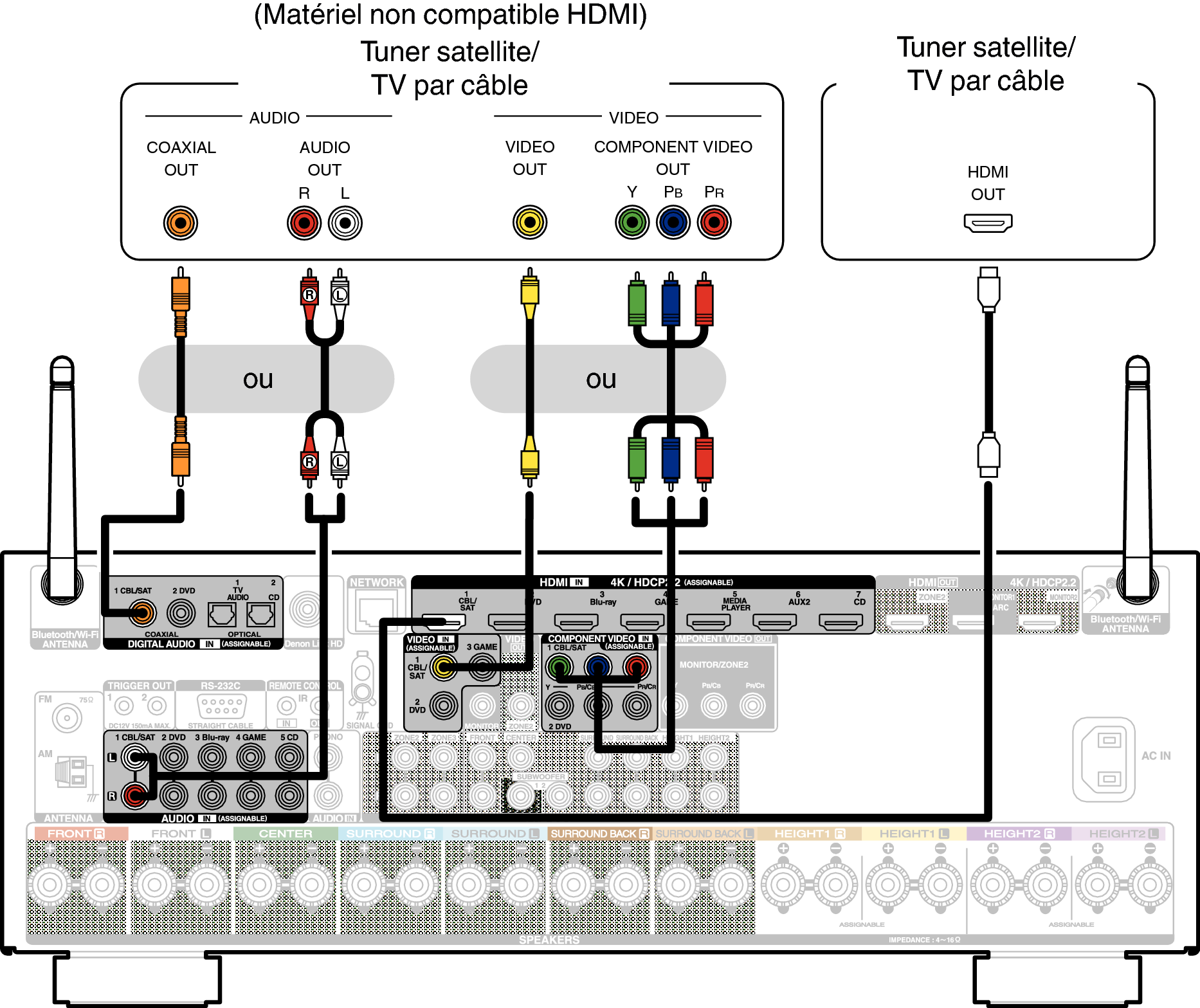 Cette explication utilise la connexion avec un tuner satellite/câble TV STB comme exemple.