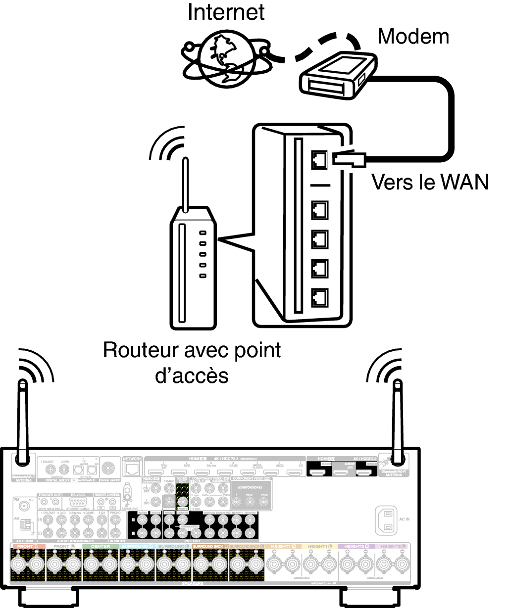 Voir “Config. Wi-Fi” pour savoir comment connecter à un routeur de réseau local sans fil. lien
