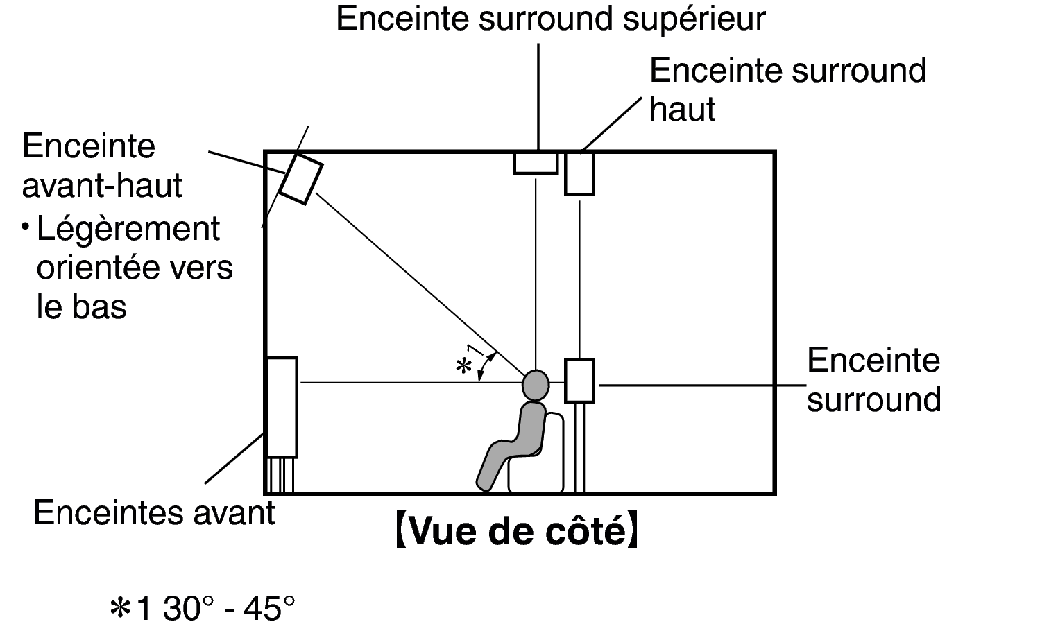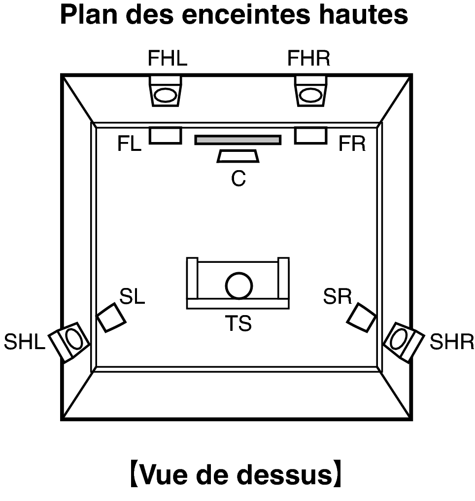 Placez les enceintes hautes avant gauche et droite directement au-dessus des enceintes avant. Installez-les aussi près que possible du plafond et réglez-les en position d’écoute principale. |