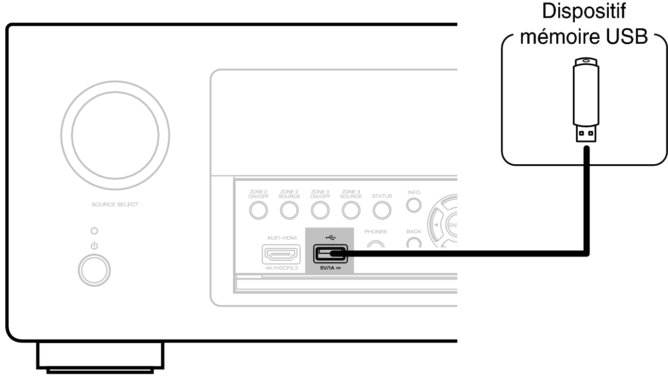 Denon ne garantit pas que tous les dispositifs mémoire USB fonctionnent ou soient alimentés. Lorsque vous utilisez un disque dur USB portable livré avec un adaptateur secteur, utilisez l’adaptateur secteur fourni avec cet appareil.