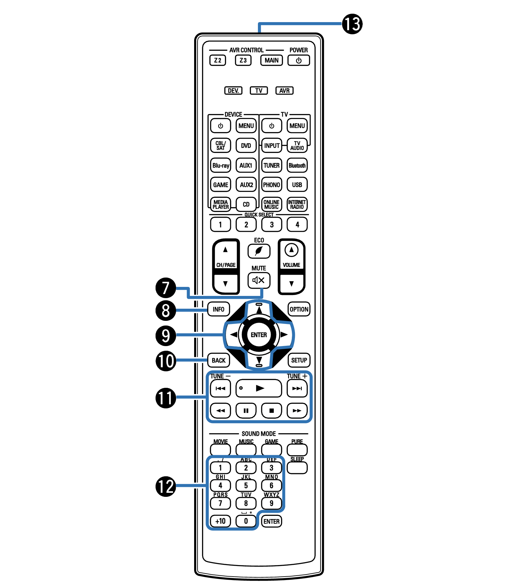 Ces touches permettent de changer la zone (MAIN ZONE, ZONE2, ZONE3) pilotée par la télécommande.