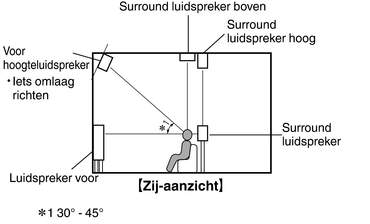 Voor de beste Auro-3D-ervaring zijn Surround hoog luidsprekers aanbevolen, maar u kunt ze vervangen door Achter hoog luidsprekers van een Dolby Atmos luidsprekerinstallatie in plaats van Surround hoog luidsprekers.