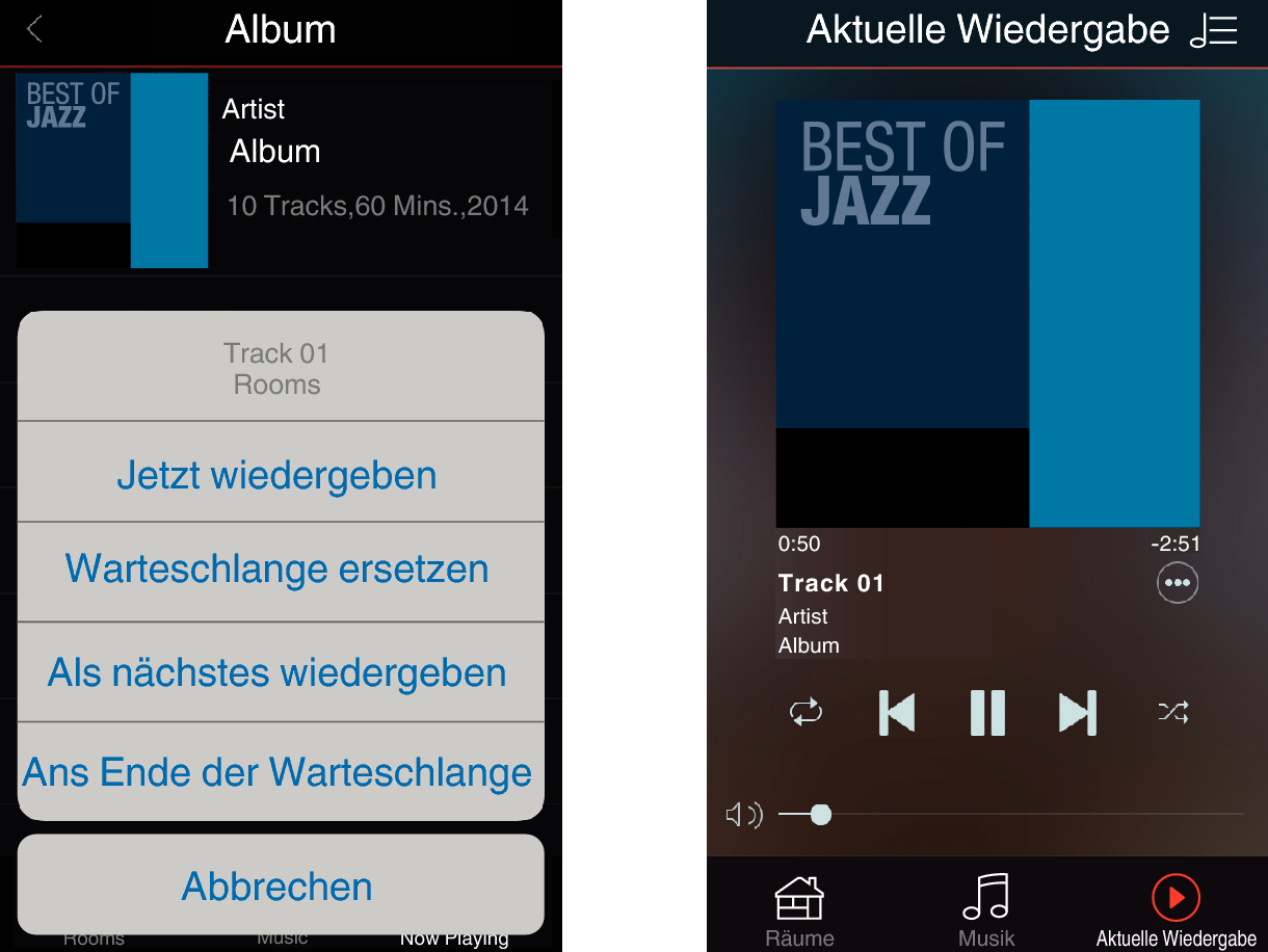 Nach Auswahl eines Musiktitels oder eines Radiosenders wechselt die App automatisch zum Bildschirm “Aktuelle Wiedergabe”.