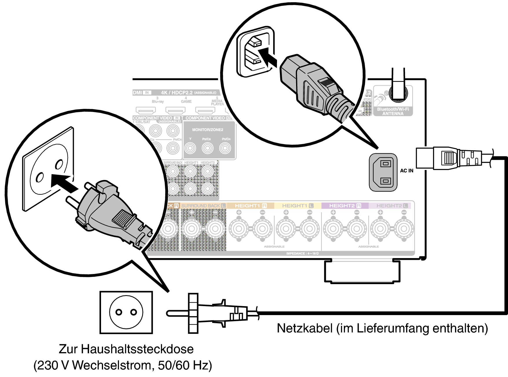 Wenn alle Anschlüsse hergestellt wurden, schließen Sie den Netzstecker an die Steckdose an.