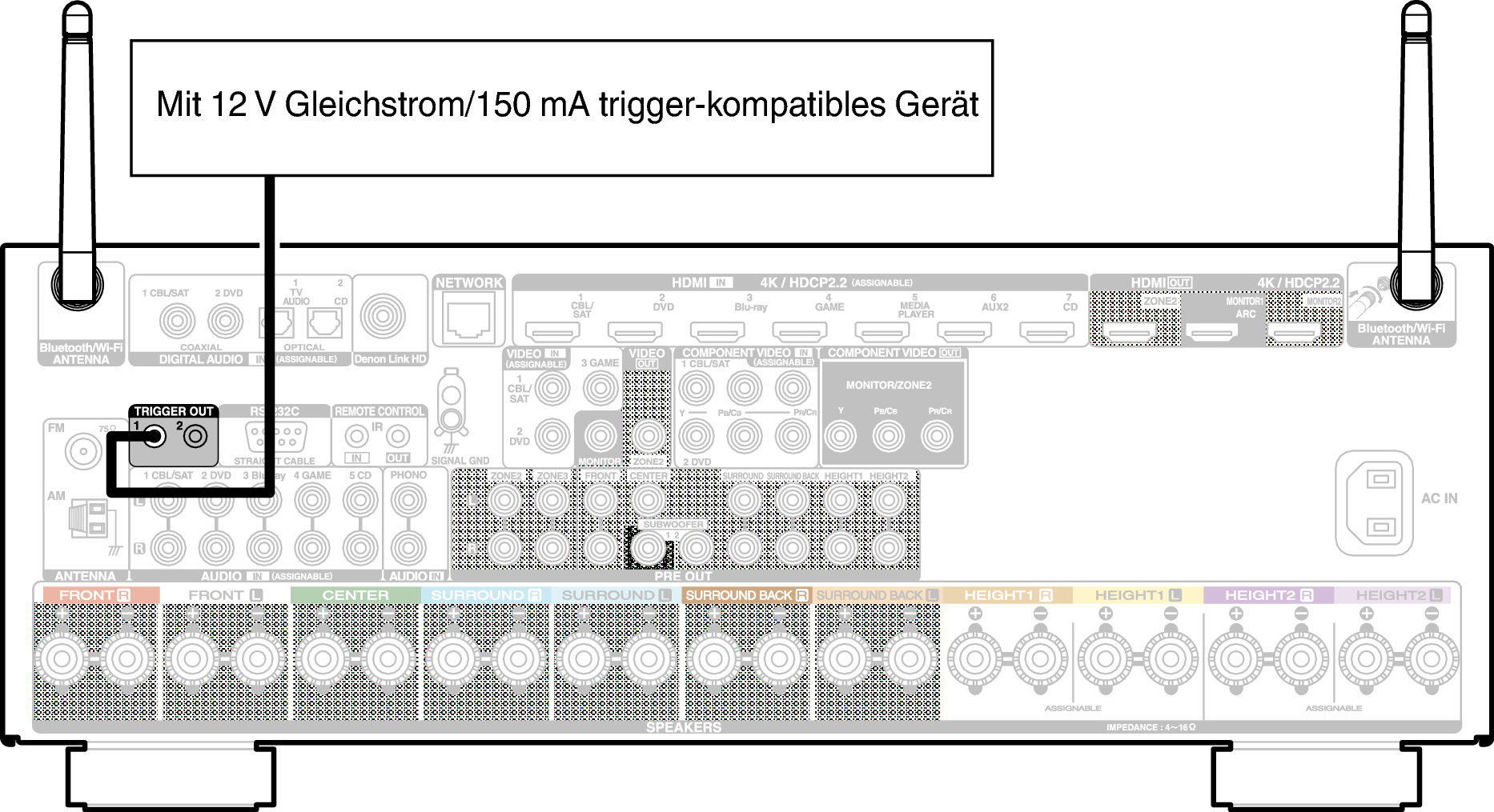 Wenn ein Gerät mit TRIGGER IN-Buchsen angeschlossen ist, lässt sich die Einschalt-/Standby-Funktion des jeweiligen Geräts über dieses Gerät durch die Gerätekopplung betätigen.