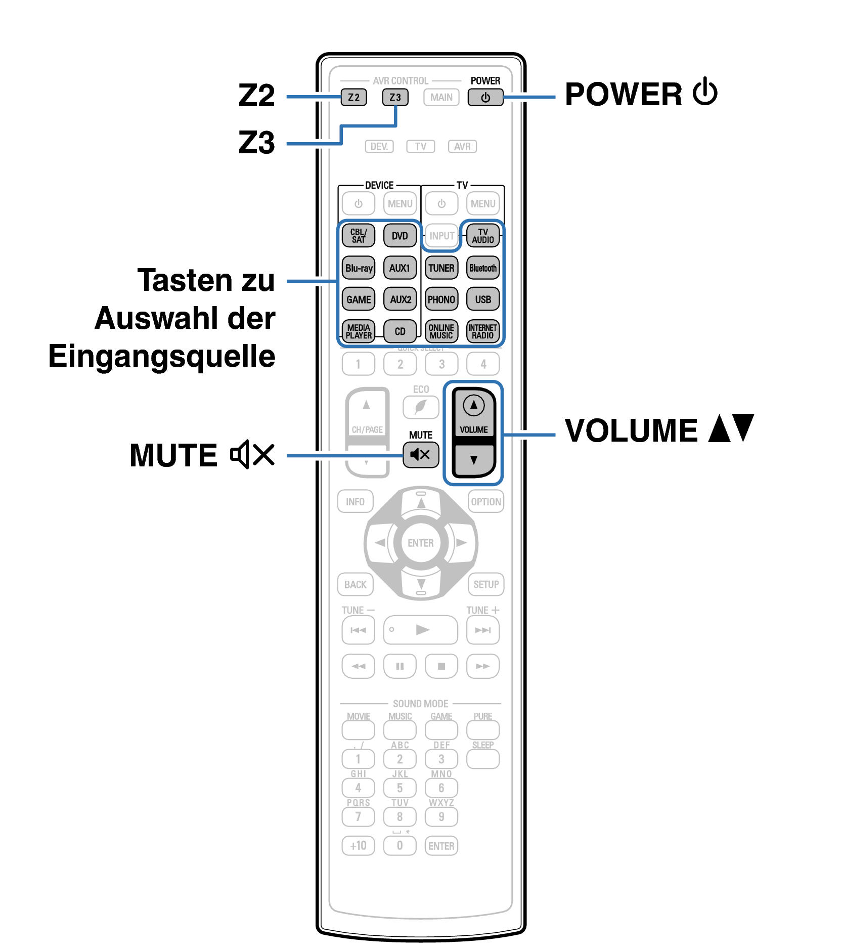 Um eine Bedienung des Geräts vorzunehmen, drücken Sie auf ZONE2 SOURCE oder ZONE3 SOURCE. Bei jedem Drücken auf ZONE2 SOURCE oder ZONE3 SOURCE wechselt die Eingangsquelle.