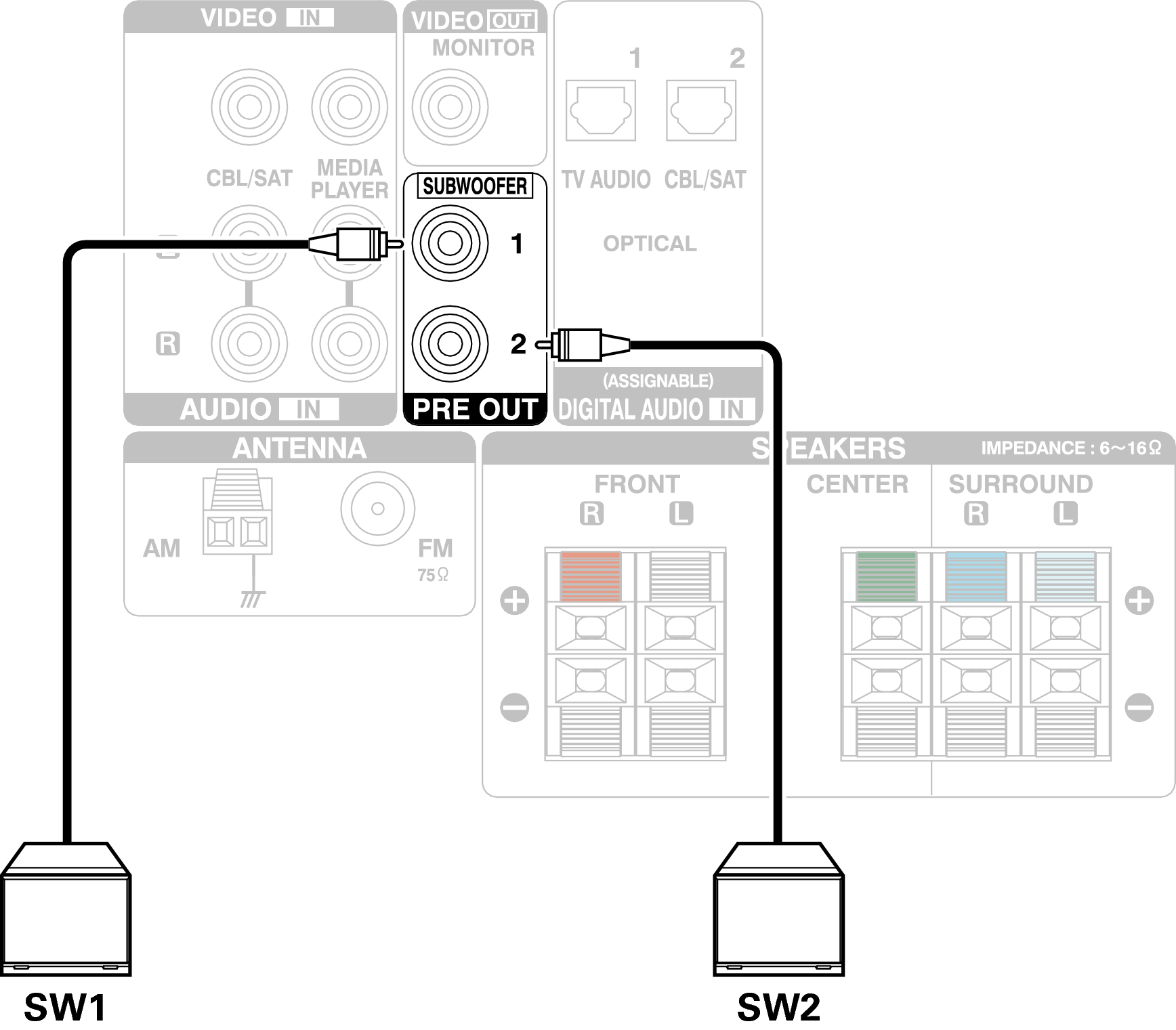 Utilice un cable para subwoofer para conectarlo. Esta unidad admite la conexión de dos subwoofers.